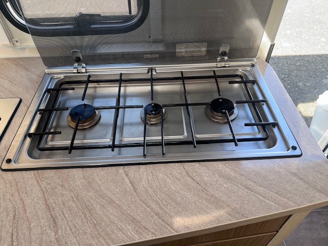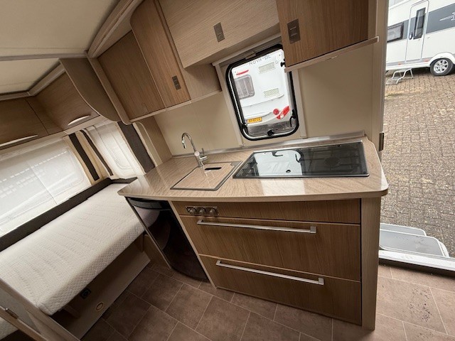 De centrale keuken is compact maar verrassend compleet: uitgerust met een 3-pits gaskomfoor, spoelbak met mengkraan, boiler voor warm water en een ruime koelkast met vriesvak. Dankzij de praktische indeling met lades en bovenkastjes heb je alles binnen handbereik voor een comfortabele maaltijd onderweg.