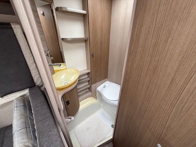 De toiletruimte met wasgelegenheid is netjes afgewerkt en biedt alles wat je nodig hebt tijdens je reis.