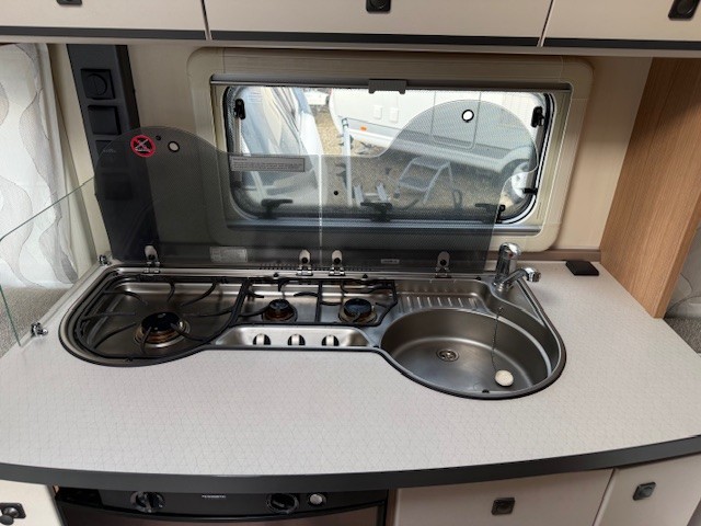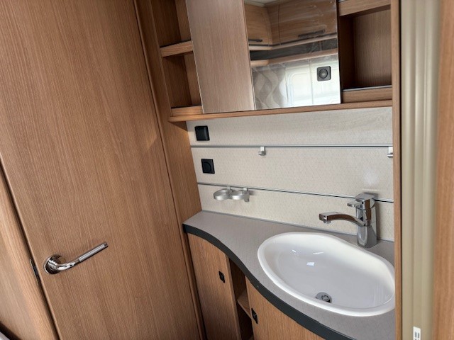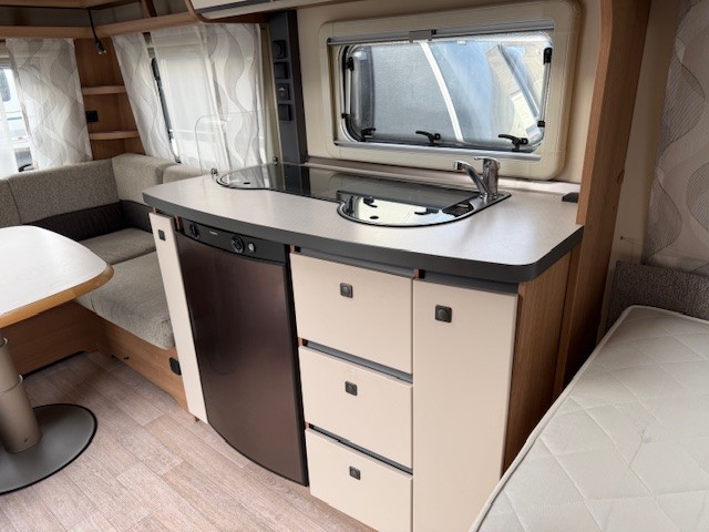 Centraal in de caravan treft u de prachtig uitgevoerde keuken, compleet uitgerust met spoelbak, kookplaat, mengkraan en een royale koelkast. Dankzij de praktische lades en de handige apothekerskast zijn al uw keukenspullen overzichtelijk en snel bereikbaar. Ook hier aan de bovenzijde weer kastruimte om alles overzichtelijk op te bergen.