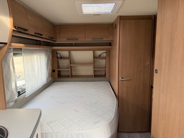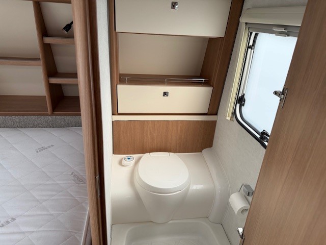 Aan de voorzijde van de caravan bevindt zich het comfortabele Franse bed, geschikt voor twee personen. Voor een optimale nachtrust is het bed voorzien van afzonderlijke lattenbodems met volledig flexibele veerbruggen en instelbare hardheid. Boven het bed zijn veel kastjes om al uw spulletjes overzichtelijk op te bergen. Ook onder het bed vindt u een zee van bergruimte, ook deze bergruimte is te bereiken via een groot serviceluik. Tevens vindt u aan de voorzijde de toiletruimte met externe wasgelegenheid. In beide ruimtes is slim gebruikgemaakt van de beschikbare ruimte, waardoor u beschikt over verrassend veel bergruimte.