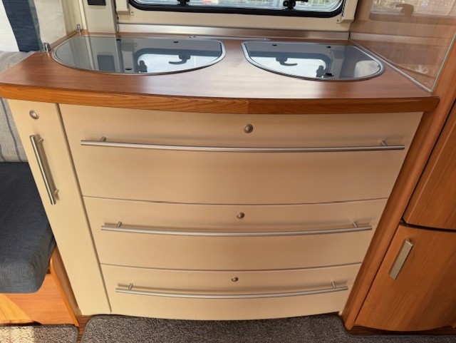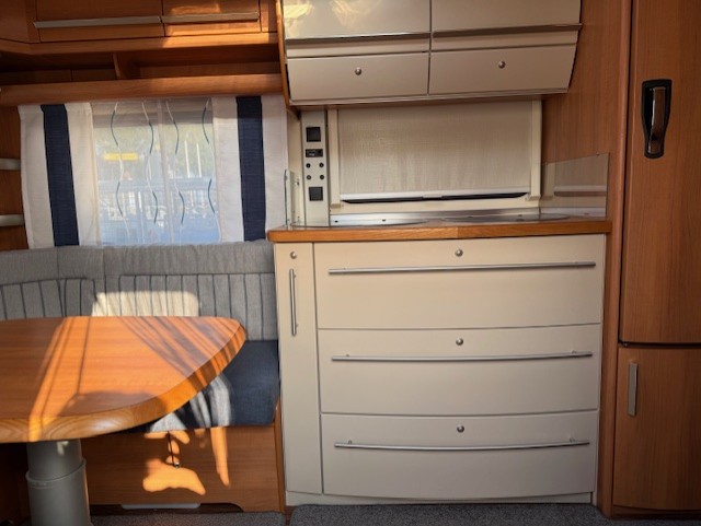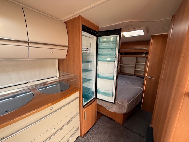 Centraal in de caravan is de goed uitgeruste keuken geplaatst, voorzien van een spoelbak, kookplaat, mengkraan en een royale hoge koelkast. De warmwater voorziening loopt via de ingebouwde boiler. Door de praktische lades en de apothekerskast zijn uw spullen altijd eenvoudig bereikbaar. Deze lades zijn voorzien van een softclose. Ook aan de bovenzijde in de keuken vindt u veel opbergruimte.