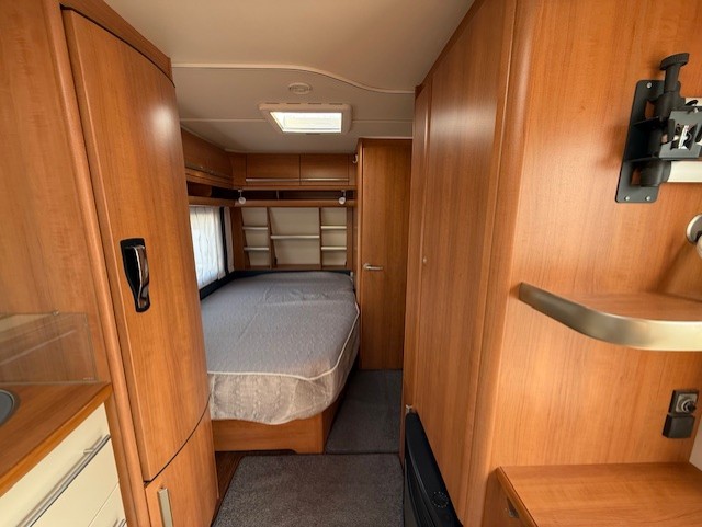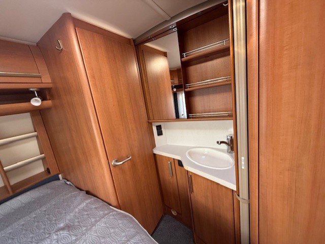 Aan de voorzijde in de caravan is het franse bed geplaatst dat ruimte biedt aan twee personen.Om u van een welverdiende nachtrust te laten genieten, heeft het bed afzonderlijke lattebodems met volledig flexibele veerbruggen met hardheidinstelling en een heerlijk matras. De bergruimte onder het bed is ook vanaf de buitenzjde via het grote serviceluik bereikbaar. Boven het bed zijn ook ruime kasten geplaatst. Tevens vindt u voorin de toiletruimte met externe wasgelegenheid. In beide ruimtes is optimaal gebruik gemaakt van het creereren van bergruimte.
