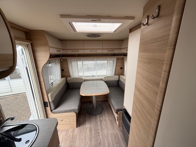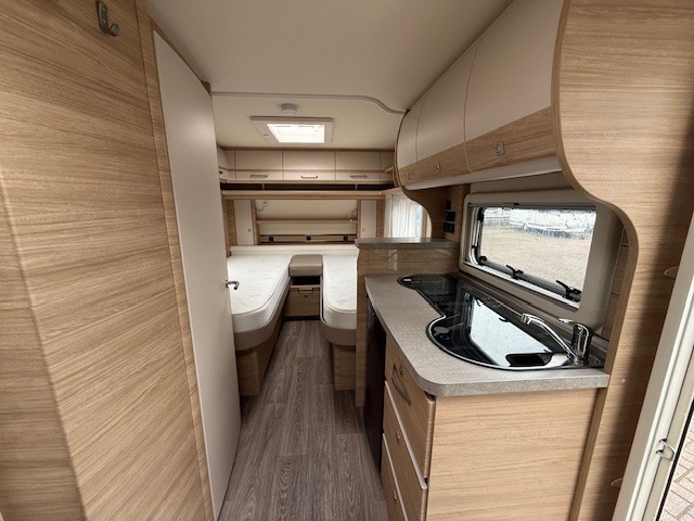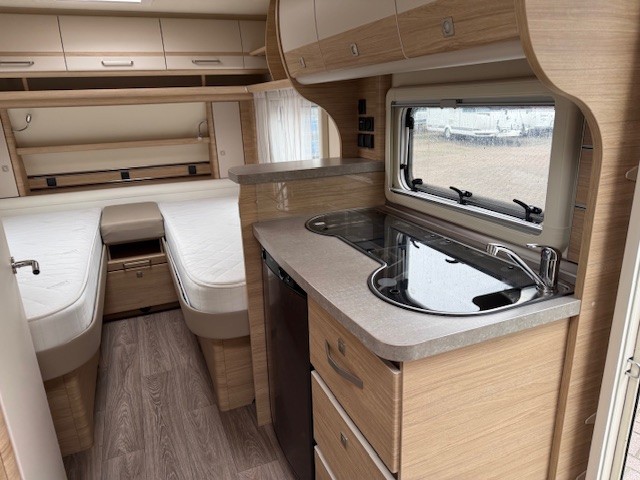 Centraal in de caravan bevindt zich de praktisch ingedeelde middenkeuken, welke geheel compleet is uitgerust met een spoelbak, mengkraan en 3-pits kooktoestel en een ruime koelkast. De handige lades, met softclose zorgen ervoor dat u altijd makkelijk bij uw spullen kunt.Maar ook hier weer veel opbergruimte in de bovenzijde van de keuken.
