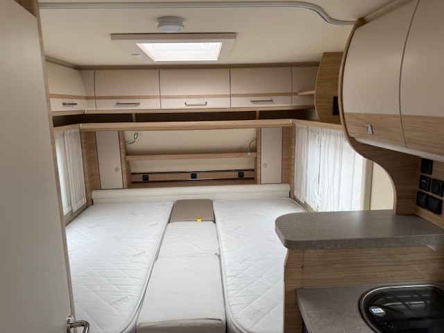 De caravan is aan de voorzijde uitgerust met twee enkele bedden. Om u van een welverdiende nachtrust te laten genieten, hebben de bedden lattebodems met volledig flexibele veerbruggen met hardheidinstelling en heerlijke matrassen. Ook is er een bedverbreding aanwezig waardoor u een super groot bed kan maken. Door de enkele bedden is de ruime hoeveelheid kasten, tel maar, boven de bedden makkelijk bereikbaar. Ook onder beide bedden is er bergruimte. De bergruimte onder het bed aan de voorzijde is ook bereikbaar via het grote serviceluik.