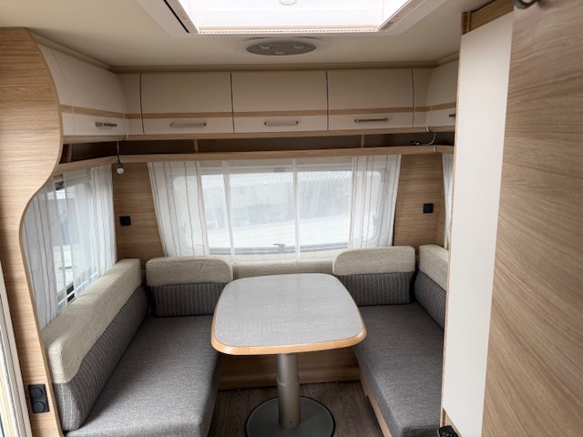 Deze prachtige Fendt 465 TG Bianco Selection is van het modeljaar 2021. De ruime, gezellige en comfortabele zit aan de achterzijde van de caravan is ideaal om aan te eten en te drinken. Het zitcomfort is hoog, de kussens hebben een hoog soortelijk gewicht en de rugkussens ergonomisch gevormd. Door de eenzuilsheftafel heeft u veel beenruimte. Uiteraard kan deze zit ook als extra slaapplaats dienen. In een handomdraai tovert u deze om. De royale hoeveelheid kasten boven de zit zorgen ervoor dat u uw spulllen geordend kunt opbergen. Ook onder de zitbanken is een zee van opbergruimte.
