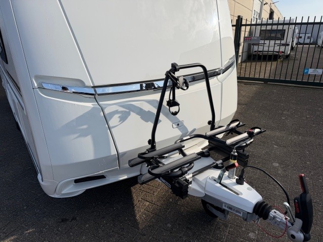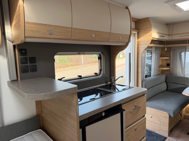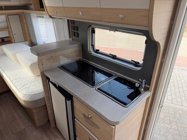 Centraal in de caravan bevindt zich de praktisch ingedeelde middenkeuken, welke geheel compleet is uitgerust met een spoelbak, mengkraan en 3-pits kooktoestel en een ruime koelkast. De handige lades, met softclose zorgen ervoor dat u altijd makkelijk bij uw spullen kunt.Maar ook hier weer veel opbergruimte in de bovenzijde van de keuken.
