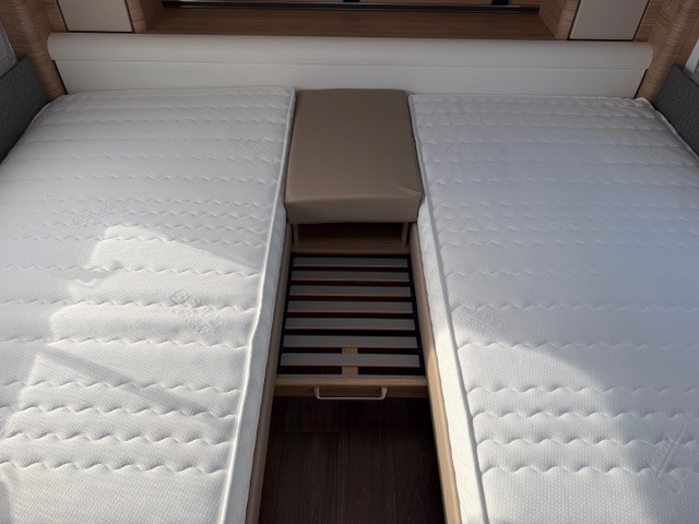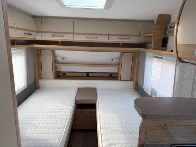 De caravan is aan de voorzijde uitgerust met twee enkele bedden. Door middel van de aanwezige bedverbreding is er eenvoudig een kingsize bed van te maken. Om u van een welverdiende nachtrust te laten genieten, hebben de bedden lattebodems met volledig flexibele veerbruggen met hardheidinstelling en heerlijke matrassen. Door de enkele bedden is de ruime hoeveelheid kasten, tel maar, boven de bedden makkelijk bereikbaar. Ook onder beide bedden is er bergruimte. De bergruimte onder het bed aan de voorzijde is ook bereikbaar via het grote serviceluik.