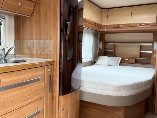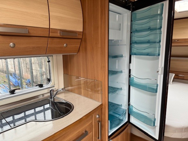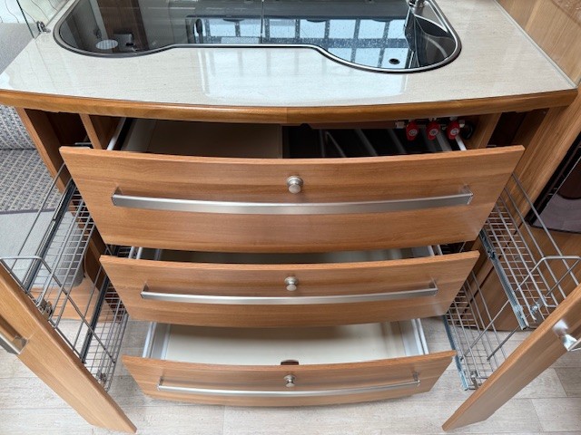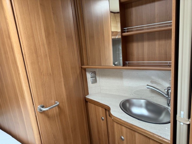 Centraal in de caravan is de praktische keuken geplaatst. Deze is voorzien van een spoelbak met mengkraan, kookplaat en een royale hoge koelkast. De warmwatervoorziening is aanwezig, en door de praktische indeling met lades en een apothekerskast zijn je spullen altijd binnen handbereik.