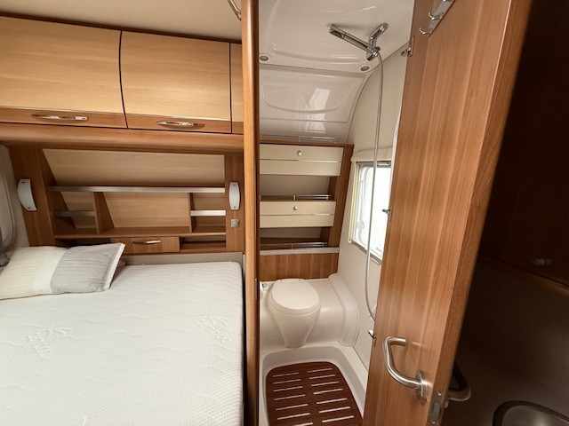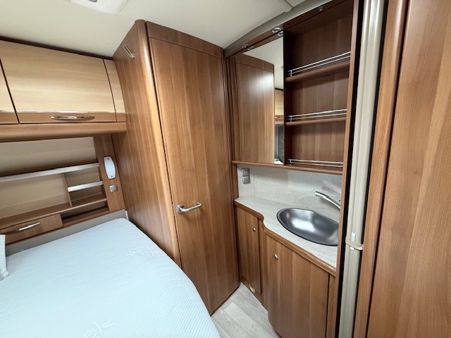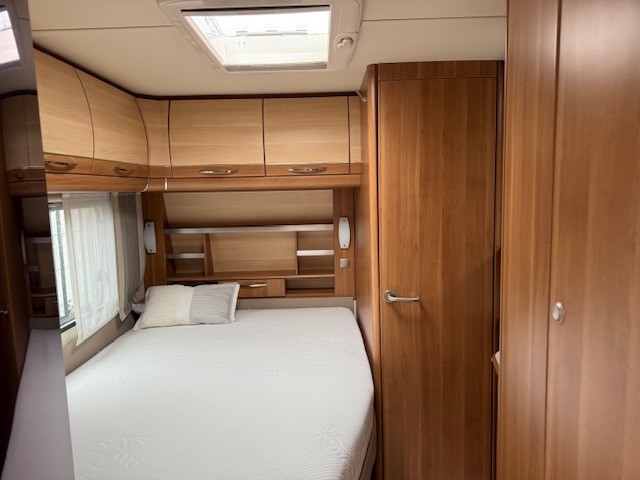 Aan de voorzijde bevindt zich het Franse bed, dat comfortabel plaats biedt aan twee personen. De lattenbodems zijn per persoon in hardheid verstelbaar, en de matrassen bieden een heerlijke ondersteuning voor een goede nachtrust. Direct naast het bed bevindt zich de toiletruimte met externe wasgelegenheid, uitgevoerd in een luxe variant met douche, een echte meerwaarde binnen deze indeling. Ook hier is optimaal gebruikgemaakt van elke centimeter kastruimte.