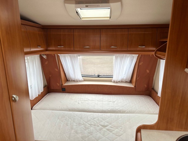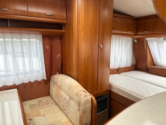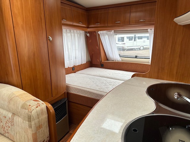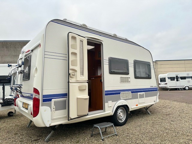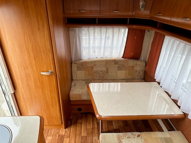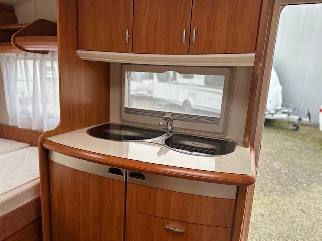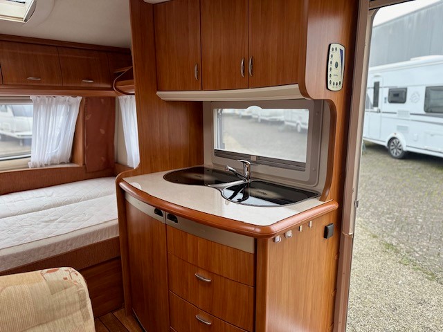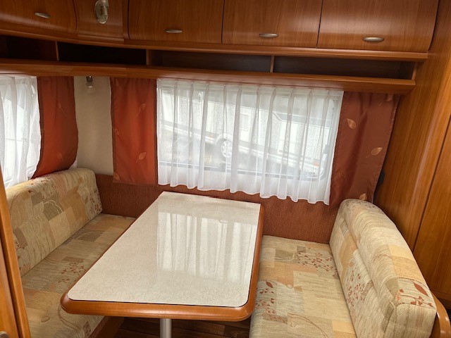 Een prima gelegenheid om gezellig te eten, drinken, lezen en borrelen wordt gevormd door de treinzit aan de achterzijde van de caravan. Uiteraard ook eenvoudig om te bouwen tot een extra slaapplek .De bergruimte onder de banken is ideaal, maar kijk ook eens naar de hoeveelheid kasten boven de zit. De compacte maar complete keuken is centraal in de caravan geplaatst en is onder andere uitgerust met een 3-pits gaskomfoor, spoelbak en mengkraan. De warmwatervoorziening loopt via de ingebouwde boiler. Er is een royale koelkast aanwezig. Ook aan de bovenzijde van de keuken is kastruimte te vinden. De lades aan de onderzijde zorgen ervoor dat uw spullen altijd makkelijk bereikbaar zijn. De caravan beschikt over een comfortabel, tweepersoons bed dat over dwars geplaatst is De lattenbodem in combinatie met het matras zorgen ervoor dat u heerlijk van uw nachtrust kunt genieten. Ook hier is aan bovenkastjes geen gebrek. De toiletruimte met interne wasgelegenheid centraal geplaatst. Uw bagage kunt u ook van de buitenzijde snel bereiken via het serviceluik. De ringverwarming zorgt voor een goede circulatie van de verwarmde lucht. De stabilisatorkoppeling zorgt voor een merkbare verbetering van het weggedrag van deze caravan. Het dakluik in de caravan zorgt voor een goede ventilatie en tevens voor voldoende daglicht in de caravan. Het luchtcirculatiesysteem zorgt voor een goede verdeling van de verwarmde lucht. De halve hordeur houdt ongedierte buiten de deur. Ook is er een mover aanwezig hiermee zet u de caravan eenvoudig op de juiste plek. De aanwezige fietsenrekken maakt dat de fietsen meekunnen. Handig voor op de camping of heerlijke voor de mooiste fietstochten. De caravan is voorzien van een voortent, hiermee vergroot u de ruimte enorm. Ook is er een stopcontact aan deze zijde bent u ook hier voorzien van stroom.