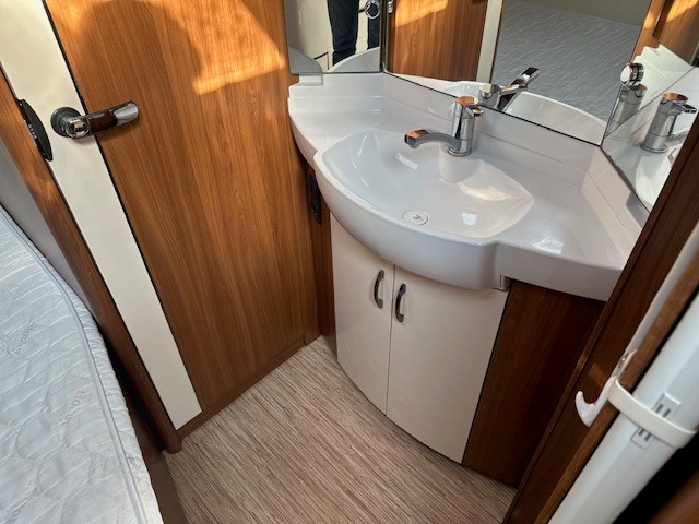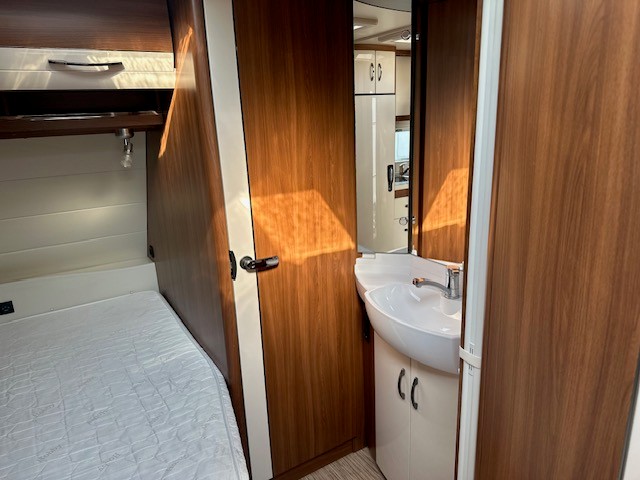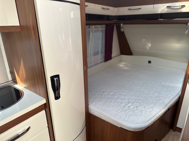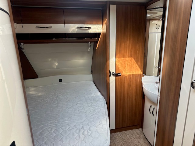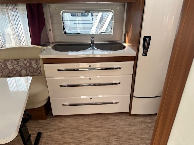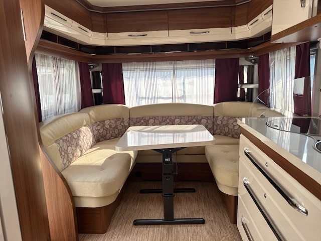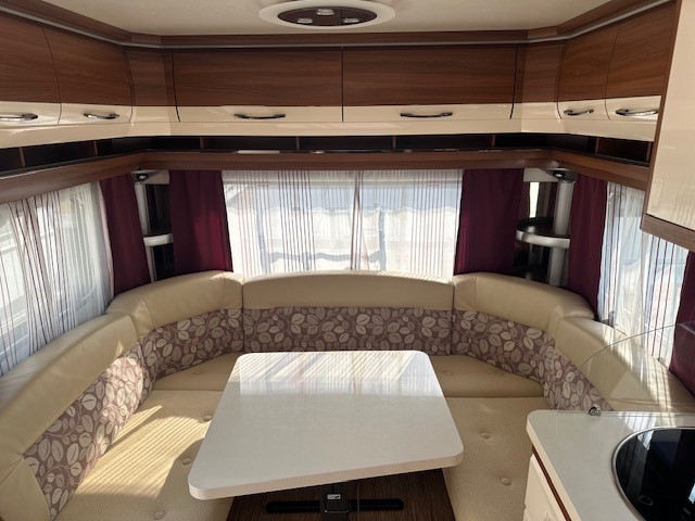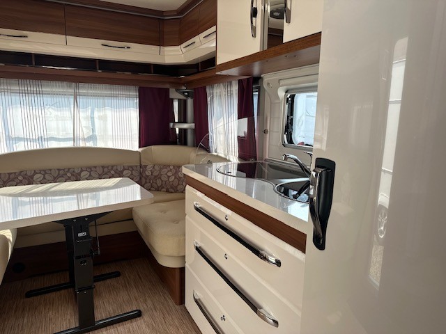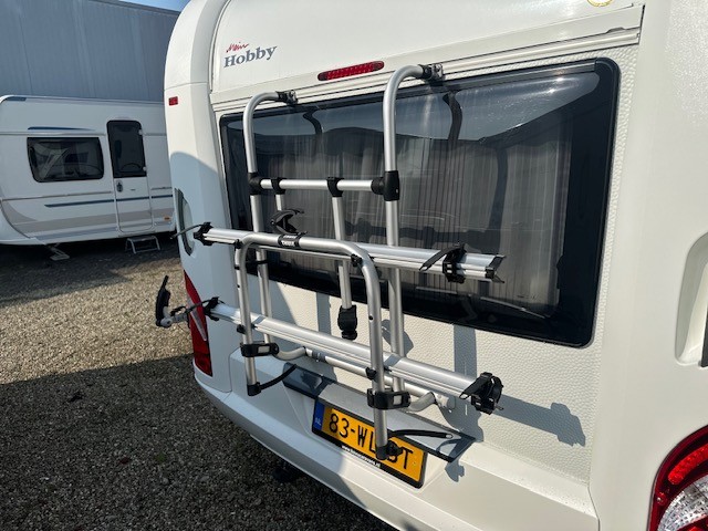 De gezellige en comfortabele rondzit aan de achterzijde van de caravan is ideaal om gezellig aan te eten en te drinken. Daarnaast kan deze zit ook als extra slaapplaats dienen. De mooie hoeveelheid kasten boven de zit zorgen ervoor dat u uw spulllen geordend kunt opbergen. Ook onder de zitbanken is een zee van opbergruimte. Centraal in de caravan bevindt zich de praktisch ingedeelde ruime middenkeuken, welke geheel compleet is uitgerust met een spoelbak, mengkraan en 3-pits kooktoestel en hoge koelkast. Een ingebouwde boiler voorziet u van warm water. De handige lades, met softclose, zorgen ervoor dat u altijd makkelijk bij uw spullen kunt. Maar ook hier weer opbergruimte in de bovenzijde van de keuken. De caravan is aan de voorzijde uitgerust met frans bed dat ruimte biedt aan twee personen. Om u van een welverdiende nachtrust te laten genieten, hebben de bedden lattebodems en een heerlijk matras Ook onder het bed is er bergruimte. De bergruimte onder het bed is ook bereikbaar via het grote serviceluik. De toiletruimte met interne wasgelegenheid bevindt zich ook aan de voorzijde van de caravan. Ook hier heeft Hobby waar mogelijk opbergruimte gecreeerd. De caravan beschikt over talrijke lichtelementen die zorgen voor een unieke atmosfeer. De caravan is voorzien van een stabilisator koppeling, deze zorgt voor een stabiele wegligging. Het grote dakluik van de caravan zorgt voor extra veel lichtinval en een goede ventilatie. Het luchtcirculatiesysteem zorgt daarbij voor een goede verdeling van de verwarmde lucht. De caravan is voorzien van een mover, hier mee zet u de caravan eenvoudig op de gewenste plaats .Ook in de disselbak is bergruimte, de dissel zelf is afgedekt door een mooie afdekkap. De caravan is voorzien van een cassetteluifel hiermee bent u in een handomdraai klaar om te relaxen. De caravan heeft niet een maar twee fietsenrekken, op deze manier kunnen de fietsen van het hele gezin mee, voor gemak op de camping of lange gezellige fietstochten.