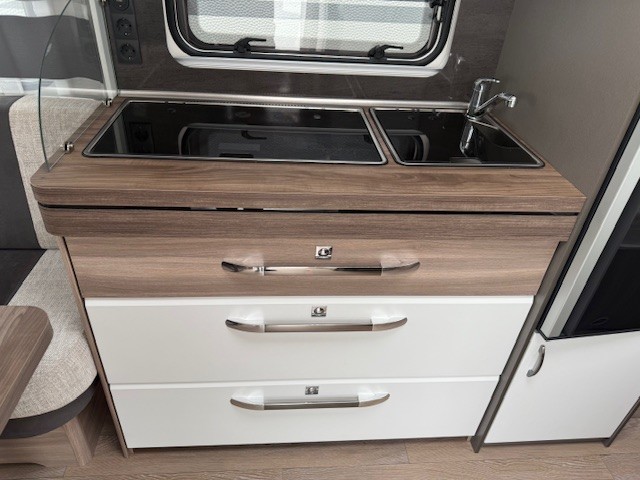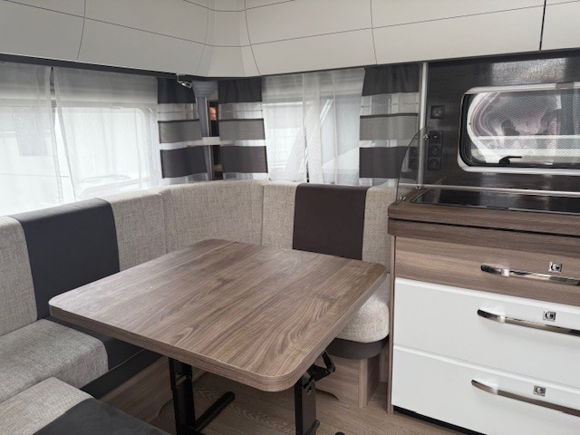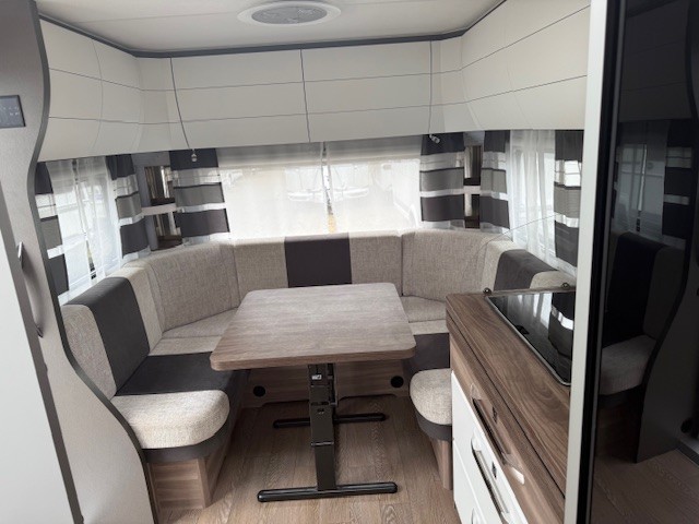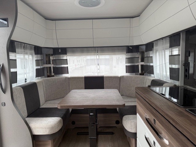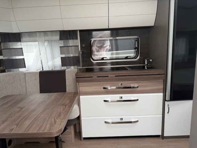 De gezellige en comfortabele rondzit aan de achterzijde van de caravan is ideaal om gezellig aan te eten en te drinken. Daarnaast kan deze zit ook als extra slaapplaats dienen. De mooie hoeveelheid kasten boven de zit zorgen ervoor dat u uw spulllen geordend kunt opbergen. Ook onder de zitbanken is een zee van opbergruimte. Centraal in de caravan bevindt zich de praktisch ingedeelde ruime middenkeuken, welke geheel compleet is uitgerust met een spoelbak, mengkraan en 3-pits kooktoestel en hoge koelkast. Een ingebouwde boiler voorziet u van warm water. De handige lades, met softclose, zorgen ervoor dat u altijd makkelijk bij uw spullen kunt. Maar ook hier weer opbergruimte in de bovenzijde van de keuken. De caravan is aan de voorzijde uitgerust met frans bed dat ruimte biedt aan twee personen. Om u van een welverdiende nachtrust te laten genieten, heeft het bed een lattebodem en een heerlijk matras Ook onder het bed is er bergruimte. De bergruimte onder het bed aan de voorzijde is ook bereikbaar via het grote serviceluik.De toiletruimte met interne wasgelegenheid bevindt zich ook aan de voorzijde van de caravan. Ook hier heeft Hobby waar mogelijk opbergruimte gecreeerd. De caravan beschikt over talrijke lichtelementen die zorgen voor een unieke atmosfeer. De caravan is voorzien van een stabilisator koppeling, deze zorgt voor een stabiele wegligging. Het grote dakluik van de caravan zorgt voor extra veel lichtinval en een goede ventilatie. Het luchtcirculatiesysteem zorgt daarbij voor een goede verdeling van de verwarmde luchtOok in de disselbak is bergruimte, de dissel zelf is afgedekt door een mooie afdekkap. Daarnaast is de carvan uitgerust met een mover, hiermee zet u de caravan eenvoudig op de gewenste plek. De caravan is voorzien van een cassetteluifel, hiermee bent u in een handomdraai klaar om te relaxen. De caravan is uitgerust met een airco, hiermee slaapt u ook in de warmste zomernacht lekker koel.