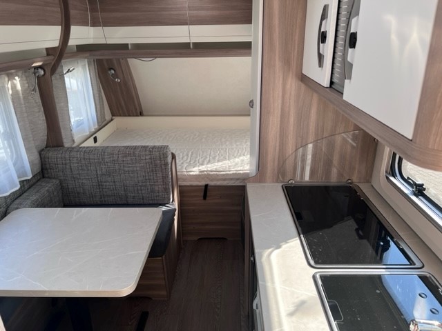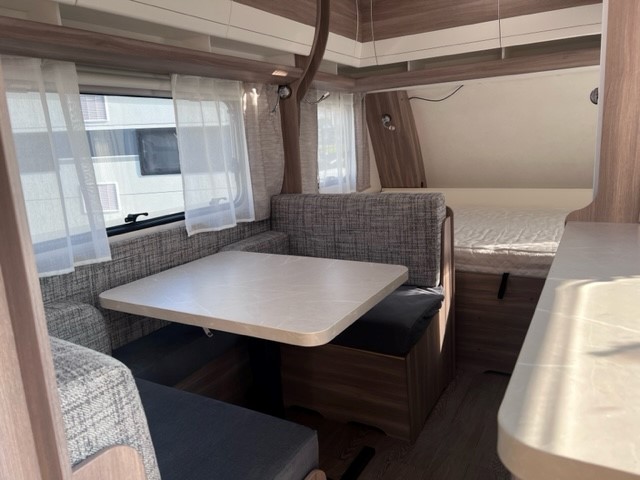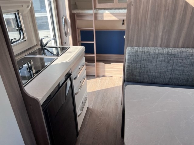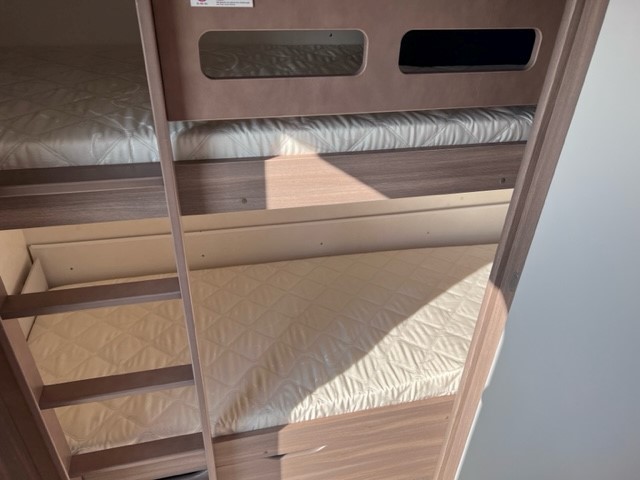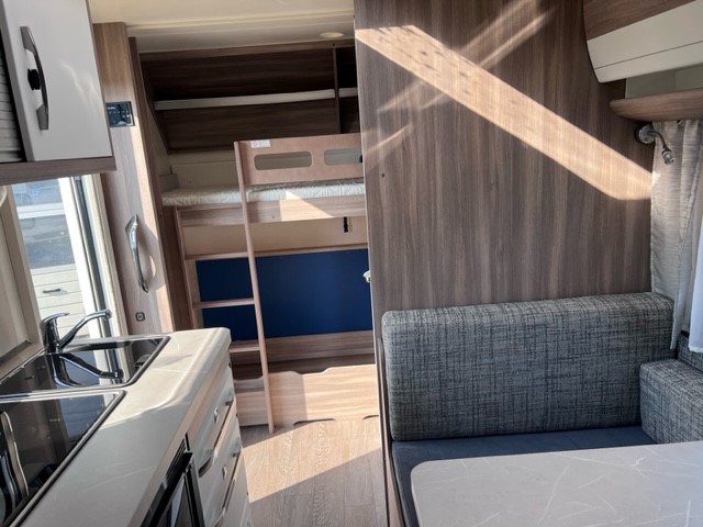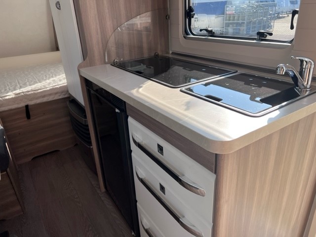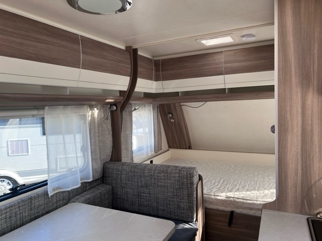 Ook de luxe uitgeruste keuken bevindt zich centraal in dit model. De keuken is voorzien van een spoelbak een mengkraan een 3 pits kooktoestel en een koelkast in een ruime uitvoering, handig en overzichtelijk. Ruime lades, met softclose, waardoor u makkelijk bij al uw spulletjes kunt. En kijk eens naar de opbergruimte aan de bovenzijde van de keuken, daar kan veel in. De warmwatervoorziening loopt via de ingebouwde boiler. Achter in de caravan is het stapelbed over dwars geplaatst. Als het onderste bed opgeklapt is kan dit dienen als speelruimte voor de kinderen. Daarnaast de toiletruimte met interne wasgelegenheid. Een grote hoeveelheid bergruimte is ideaal. De ingebouwde stabilisator koppeling zorgt voor een stabiele wegligging. Het grote dakluik van de caravan zorgt voor extra veel lichtinval en een goede ventilatie. Het luchtcirculatiesysteem zorgt daarbij voor een goede verdeling van de verwarmde lucht. De caravan beschikt over talrijke lichtelementen die zorgen voor een unieke atmosfeer.De prachtige hobby wieldoppen staan er fantastisch bij. De verzwaarde uitdraaisteunen geven de caravan extra stabiliteit. De caravan is voorzien van een verzwaarde as die beladen mag worden tot 1500 KG en een fietsenrek aan de voorzijde. Daarnaast is de caravan voorzien van een solera lux 2 luifel.