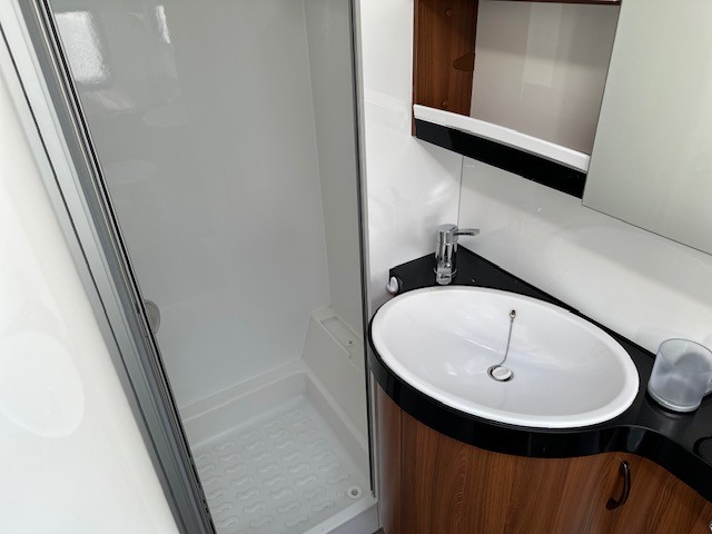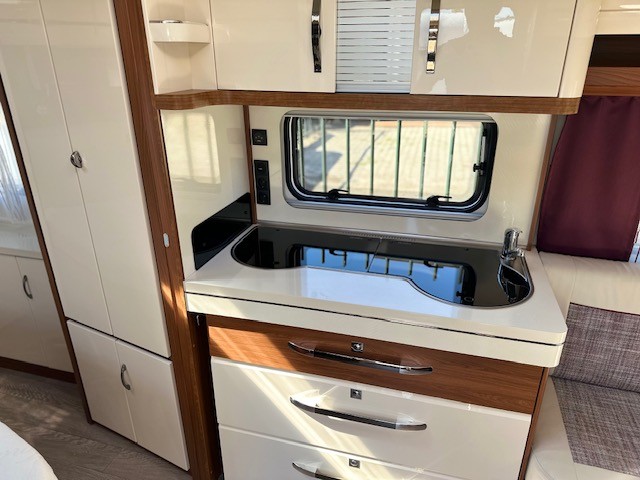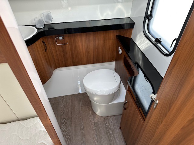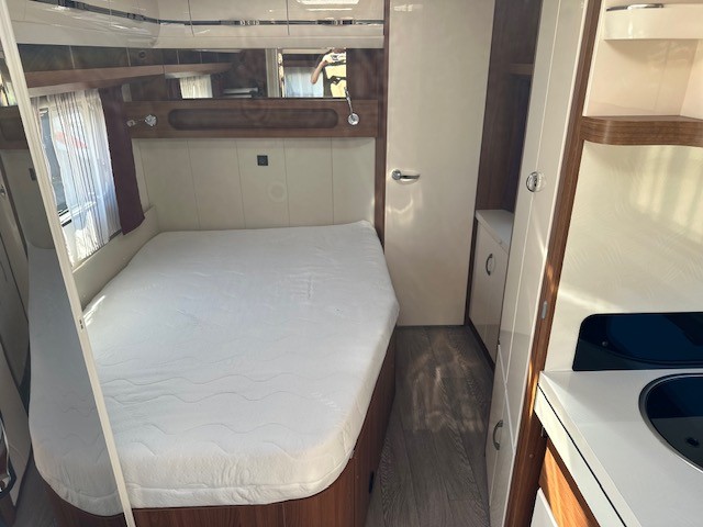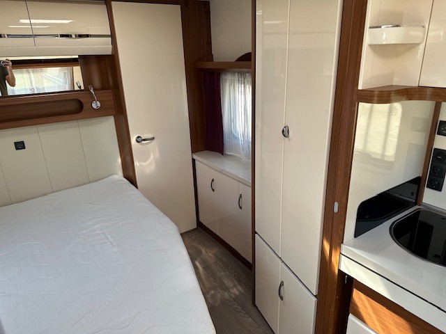 De gezellige en comfortabele zit aan de voorzijde van de caravan is ideaal om gezellig aan te eten en te drinken. Daarnaast kan deze zit ook als extra slaapplaats dienen. De mooie hoeveelheid kasten boven de zit zorgen ervoor dat u uw spulllen geordend kunt opbergen. Ook onder de zitbanken is een zee van opbergruimte. Centraal in de caravan bevindt zich de praktisch ingedeelde ruime middenkeuken, welke geheel compleet is uitgerust met een spoelbak, mengkraan en 3-pits kooktoestel en hoge koelkast. De handige lades, met softclose, zorgen ervoor dat u altijd makkelijk bij uw spullen kunt. Maar ook hier weer opbergruimte in de bovenzijde van de keuken. De caravan is uitgerust met frans bed dat ruimte biedt aan twee personen. Om u van een welverdiende nachtrust te laten genieten heeft het bed lattebodems en een heerlijk matras Ook onder het bed is er bergruimte. De bergruimte onder het bed aan de voorzijde is ook bereikbaar via het grote serviceluik. De badkamer bevindt zich over de totale breedte van de caravan, met toilet, interne wasgelegenheid en een douche, hiermee bent u niet meer afhankelijk van de sanitaire voorzieningen op de camping