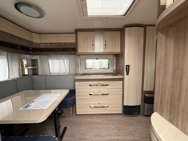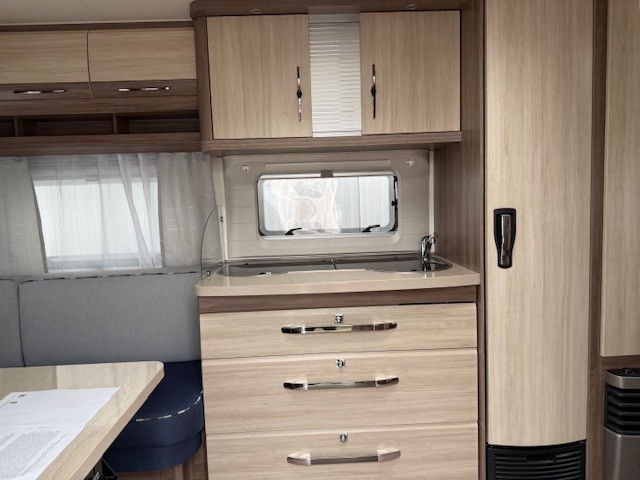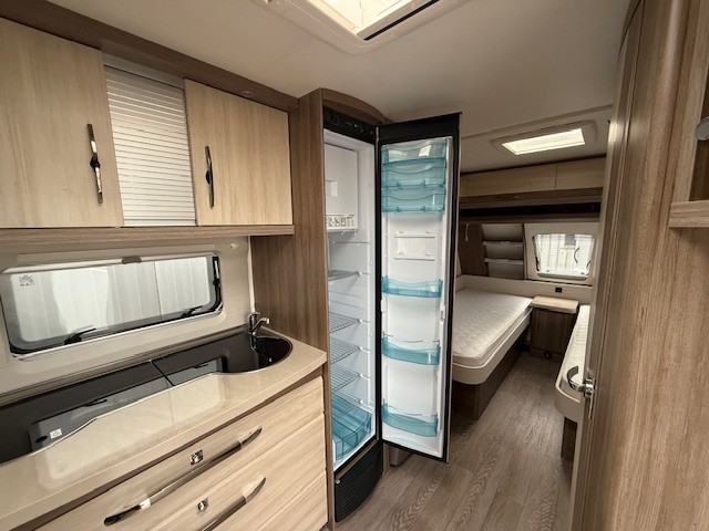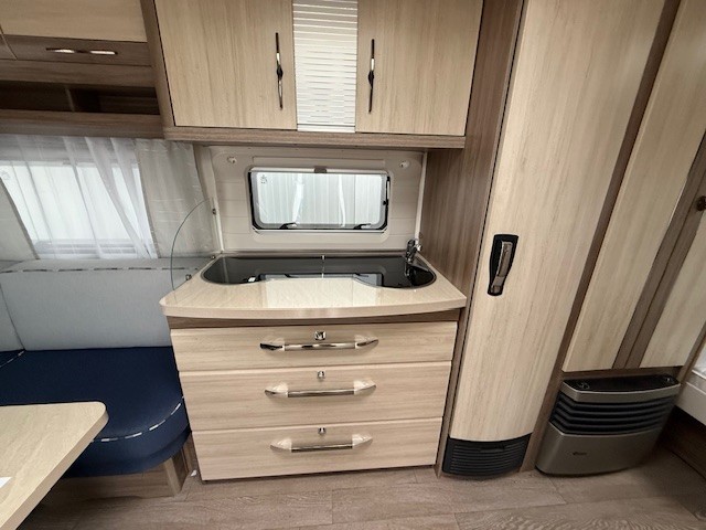 Centraal in de caravan ligt de goed uitgeruste keuken, met een 3-pits gaskomfoor, spoelbak met mengkraan, warmwatervoorziening via de ingebouwde boiler en een hoge, ruime koelkast met vriesvak. Dankzij de praktische indeling met lades en veel kastruimte boven de keuken heeft u alles bij de hand om comfortabel te koken.