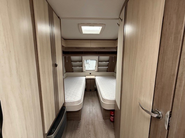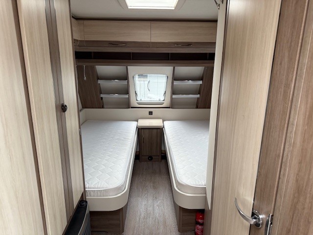 Aan de voorzijde bevinden zich de twee eenpersoonsbedden, elk voorzien van een lattenbodem en comfortabele matrassen. Boven de bedden is volop kastruimte aanwezig, en ook onder beide bedden bevindt zich extra bergruimte. De opbergruimte onder het voorste bed is bovendien van buitenaf bereikbaar via het grote serviceluik.