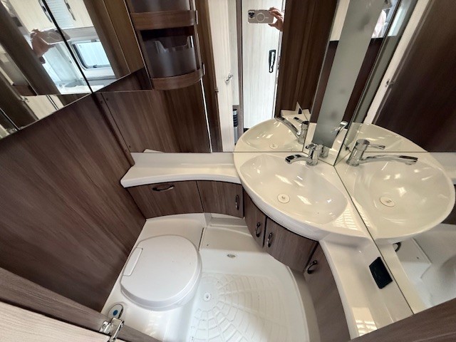 De toiletruimte met interne wasgelegenheid bevindt zich in het midden van de caravan. Ook hier heeft Hobby de ruimte optimaal benut met praktische kastjes en een verzorgde afwerking.