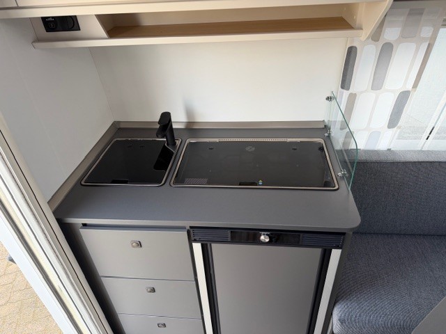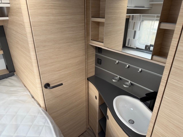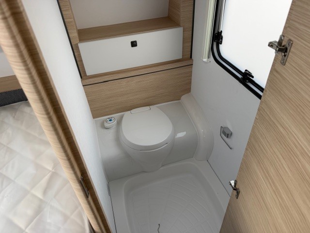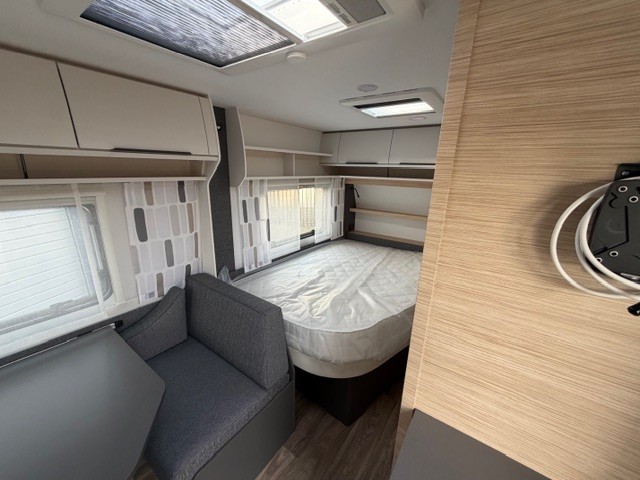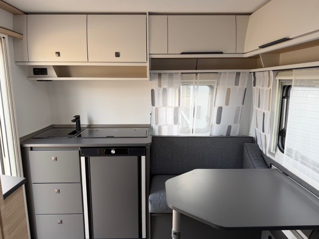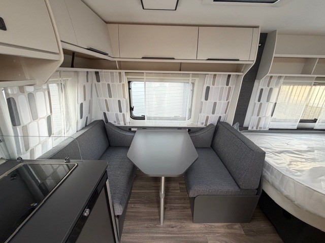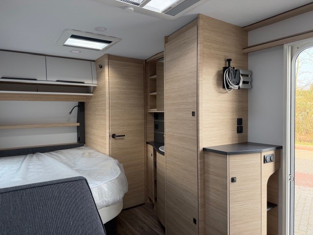 Een prima gelegenheid om gezellig te eten, drinken, lezen en borrelen wordt gevormd door de treinzit aan de achterzijde van de caravan. Uiteraard ook eenvoudig om te bouwen tot een extra slaapplek. De bergruimte onder de banken is ideaal, maar kijk ook eens naar de hoeveelheid kasten boven de zit. De compacte maar complete keuken is onder andere uitgerust met een 3-pits gascomfoor, spoelbak en mengkraan.De ingebouwde koelkast met vriesvak is uitgevoerd in een ruime uitvoering. Ook aan de bovenzijde van de keuken is kastruimte te vinden. De lades aan de onderzijde zorgen ervoor dat uw spullen altijd makkelijk bereikbaar zijn. De caravan beschikt over een comfortabel, tweepersoons frans bed. De lattebodems met elastische veerbruggen in combinatie met het matras zorgen ervoor dat u heerlijk van uw nachtrust kunt genieten. Ook hier is aan bovenkastjes geen gebrek. De toiletruimte met externe wasgelegenheid is naast het bed te vinden. Uw bagage onder het bed kunt u ook van de buitenzijde snel bereiken via het serviceluik. U zult in deze caravan, dankzij de ingebouwde hordeur, minder last van insecten hebben. De stabilisatorkoppeling zorgt voor een merkbare verbetering van het weggedrag van deze caravan. Het dakluik in de caravan zorgt voor een goede ventilatie en tevens voor voldoende daglicht in de caravan. Het luchtcirculatiesysteem zorgt voor een goede verdeling van de verwarmde lucht.