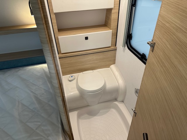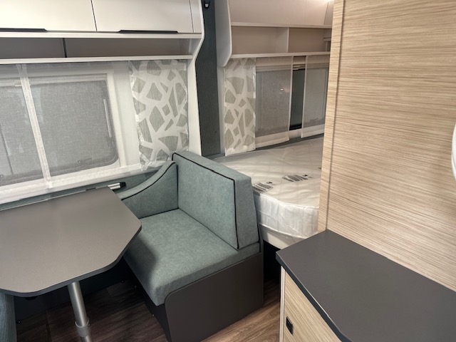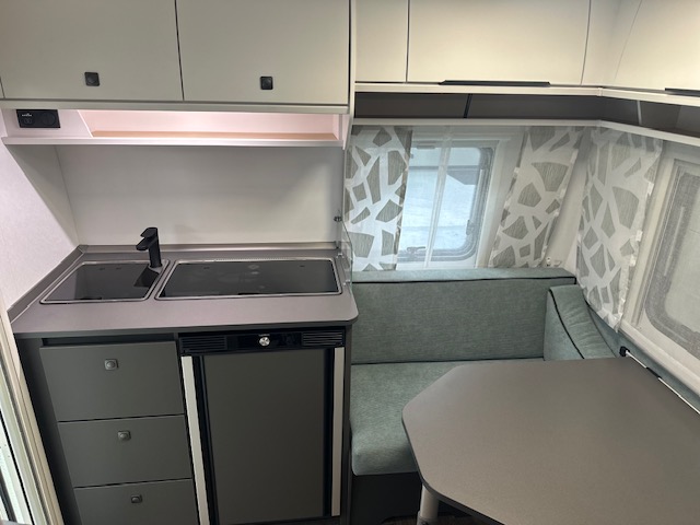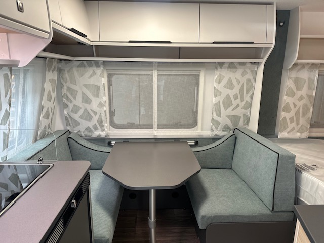 Een prima gelegenheid om gezellig te eten, drinken, lezen en borrelen wordt gevormd door de treinzit aan de achterzijde van de caravan. Uiteraard ook eenvoudig om te bouwen tot een extra slaapplek. De bergruimte onder de banken is ideaal, maar kijk ook eens naar de hoeveelheid kasten boven de zit. De compacte maar complete keuken is onder andere uitgerust met een 3-pits gascomfoor, spoelbak en mengkraan.De ingebouwde koelkast met vriesvak is uitgevoerd in een ruime uitvoering. Ook aan de bovenzijde van de keuken is kastruimte te vinden. De lades aan de onderzijde zorgen ervoor dat uw spullen altijd makkelijk bereikbaar zijn. De caravan beschikt over een comfortabel, tweepersoons frans bed. De lattebodems met elastische veerbruggen in combinatie met het matras zorgen ervoor dat u heerlijk van uw nachtrust kunt genieten. Ook hier is aan bovenkastjes geen gebrek. De toiletruimte met externe wasgelegenheid is naast het bed te vinden. Uw bagage onder het bed kunt u ook van de buitenzijde snel bereiken via het serviceluik. Uzult in deze caravan, dankzij de ingebouwde hordeur, minder last van insecten hebben. De stabilisatorkoppeling zorgt voor een merkbare verbetering van het weggedrag van deze caravan. Het dakluik in de caravan zorgt voor een goede ventilatie en tevens voor voldoende daglicht in de caravan. Het luchtcirculatiesysteem zorgt voor een goede verdeling van de verwarmde lucht.