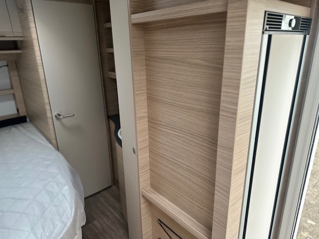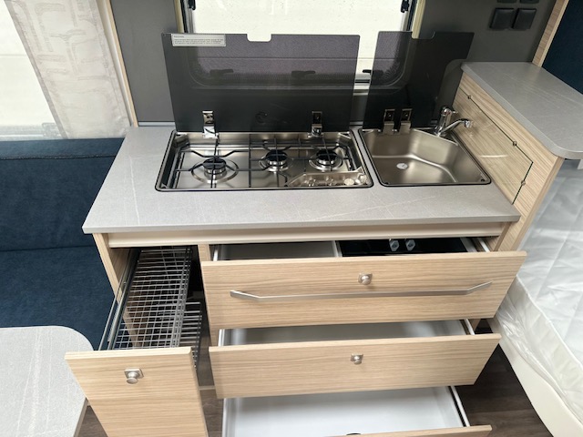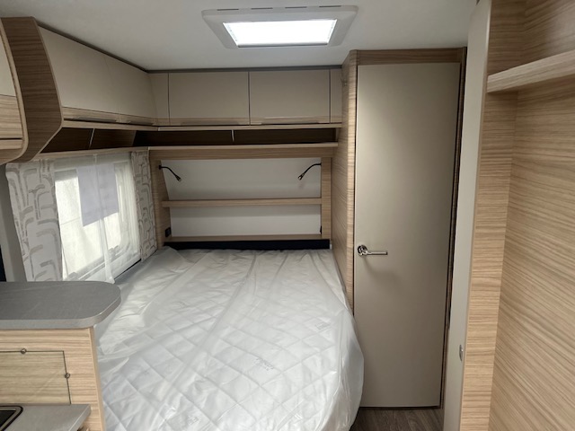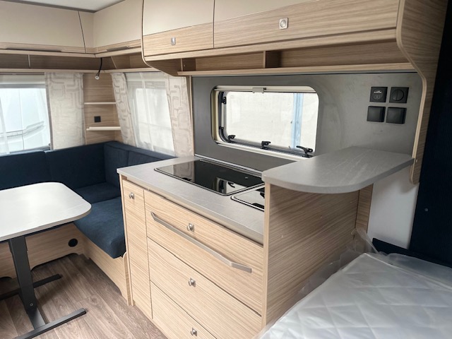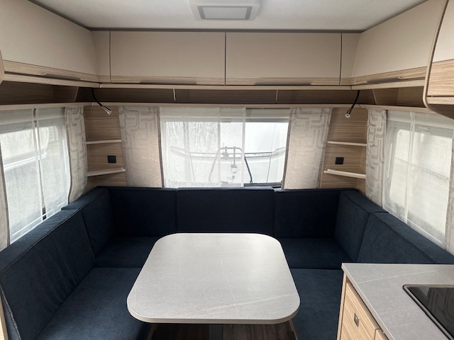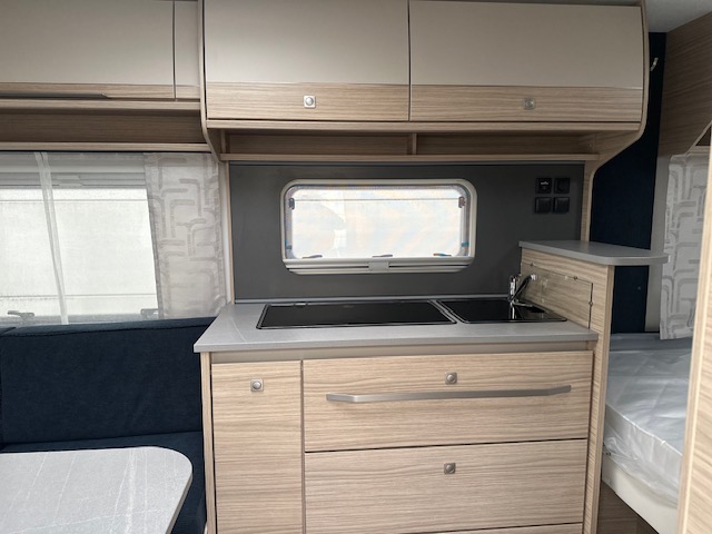 De rechte hoeken in deze rondzit maken dat u heerlijk ontspannen in de hoek kunt zitten. Tevens is deze zit eenvoudig om te bouwen tot een comfortabele extra slaapplaats. Centraal in de caravan is de prachtige keuken geplaatst, voorzien van een spoelbak , kookplaat, mengkraan en royale hoge koelkast, deze is tegenover de keuken geplaatst. Doordat er een verhoging gedeelte in de keuken is geplaatst is hier extra afzetruimte gecreëerd. Handig voor bijvoorbeeld een koffiezetter of waterkoker. De koelkast met een inhoud van 133 liter is zowel links als rechts te openen waardoor u ook vanaf buiten makkelijk bij uw gekoelde etenswaren kunt. De warmwater voorziening loopt via de ingebouwde truma combi 4e ketel. Door de praktische lades en de apothekerskast zijn uw spullen altijd eenvoudig bereikbaar. De lades zijn voorzien van een softclose en transportsluiting. Aan de voorzijde in de caravan is het franse bed geplaatst dat ruimte biedt aan twee personen. Om u van een welverdiende nachtrust te laten genieten, heeft het bed afzonderlijke lattebodems met volledig flexibele veerbruggen met hardheidinstelling. Tevens vindt u voorin de toiletruimte met externe wasgelegenheid. In beide ruimtes is optimaal gebruik gemaakt van het creëren van bergruimte. U zult in deze caravan, dankzij de ingebouwde hordeur, minder last van insecten hebben.De stabilisatorkoppeling zorgt voor een merkbare verbetering van het weggedrag van deze caravan.Het dakluik in de caravan zorgt voor een goede ventilatie en tevens voor voldoende daglicht in de caravan.Het luchtcirculatiesysteem zorgt voor een goede verdeling van de verwarmde lucht.