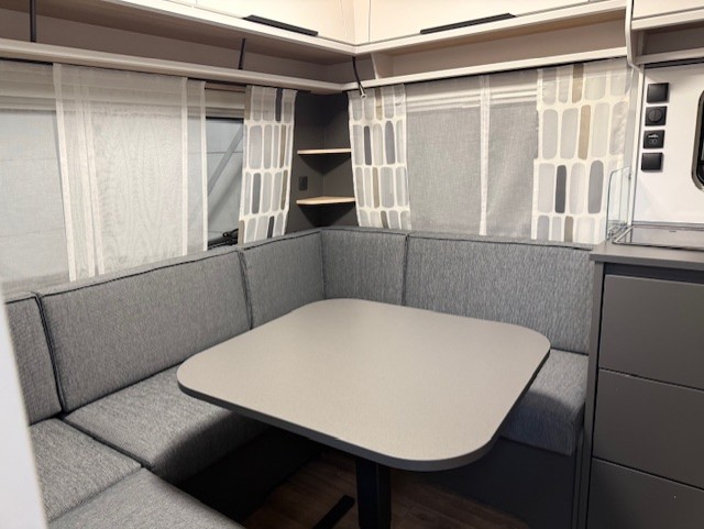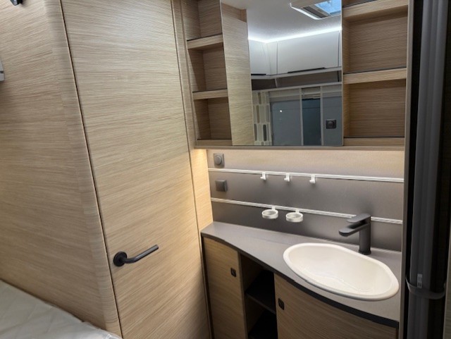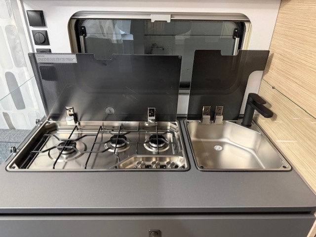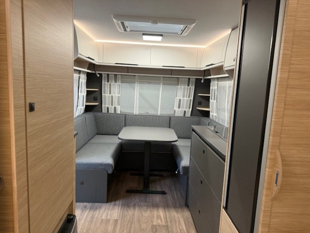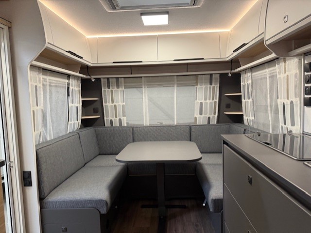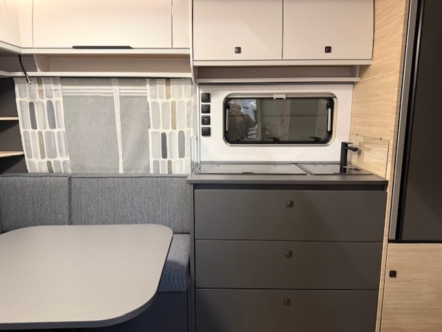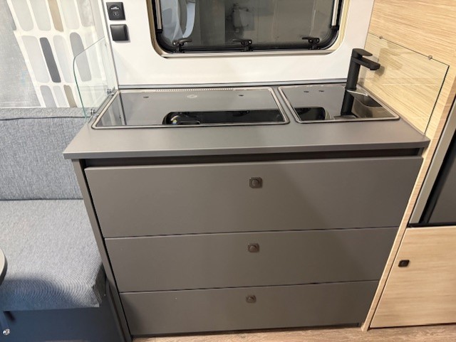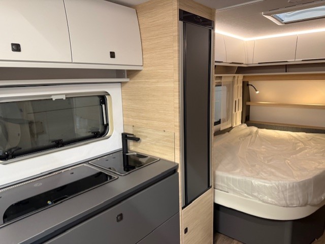 Centraal in de caravan is de goed uitgeruste keuken geplaatst, voorzien van een spoelbak , kookplaat, mengkraan en een royale hoge koelkast.De koelkast is zowel links als rechts te openen waardoor iedereen makkelijk bij de gekoelde etenswaren kan zonder elkaar in de weg te lopen. De warmwater voorziening loopt via de ingebouwde boiler. Door de praktische lades en de apothekerskast zijn uw spullen altijd eenvoudig bereikbaar.Deze lades zijn voorzien van een softclose en transportsluiting.Ook aan de bovenzijde in de keuken vindt u veel opbergruimte.