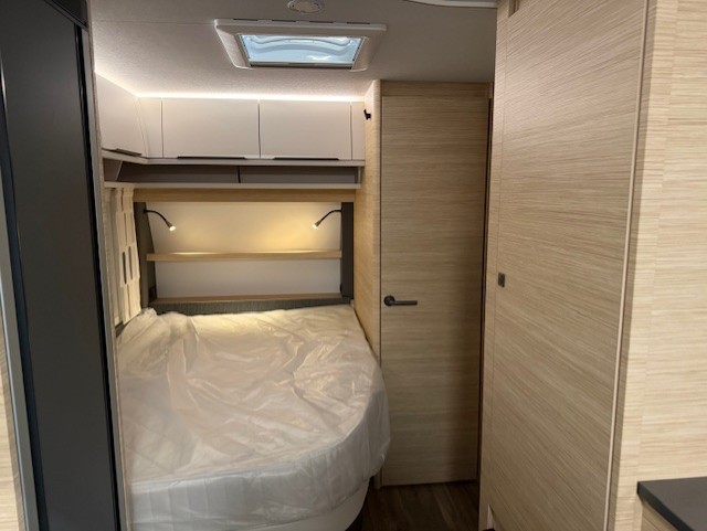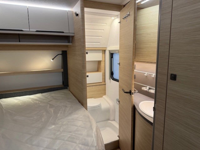 Aan de voorzijde in de caravan is het franse bed geplaatst dat ruimte biedt aan twee personen.Om u van een welverdiende nachtrust te laten genieten, heeft het bed afzonderlijke lattebodems met volledig flexibele veerbruggen met hardheidinstelling en een heerlijkmartras. De bergruimte onder het bed is ook vanaf de buitenzijde via het grote serviceluik bereikbaar. Boven het bed zijn ook ruime kasten geplaatst. Tevens vindt u voorin de toiletruimte met externe wasgelegenheid. Alle ruimte om u lekker op te frissen. In beide ruimtes is optimaal gebruik gemaakt van het creereren van bergruimte.