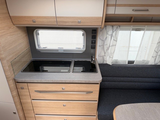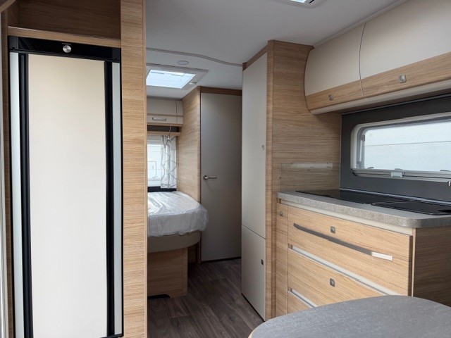Centraal in de caravan is de keuken gesitueerd. Deze is praktisch en overzichtelijk ingericht en voorzien van een spoelbak, kookplaat en mengkraan. De ruime lades bieden volop opbergruimte en zijn uitgerust met softclose en een transportsluiting, zodat uw inventaris ook tijdens het rijden veilig opgeborgen blijft. De hoge koelkast met een inhoud van 133 liter bevindt zich direct om de hoek van de toegangsdeur. Deze slimme plaatsing maakt de koelkast zowel van binnen als van buiten eenvoudig bereikbaar, wat het gebruiksgemak op de camping aanzienlijk vergroot.