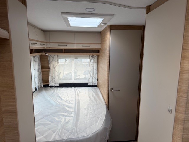 Aan de achterzijde van de caravan treft u het comfortabele Franse bed, dat plaats biedt aan twee personen. Het bed is voorzien van afzonderlijke lattenbodems met volledig flexibele veerbruggen en een instelbare hardheid, gecombineerd met een comfortabel matras. Dit alles zorgt voor een uitstekende nachtrust. Ook aan de achterzijde bevindt zich de toiletruimte met externe wasgelegenheid. Zowel in de slaap, als sanitaire ruimte is optimaal gebruikgemaakt van de beschikbare bergruimte, zodat u al uw spullen netjes kunt opbergen.