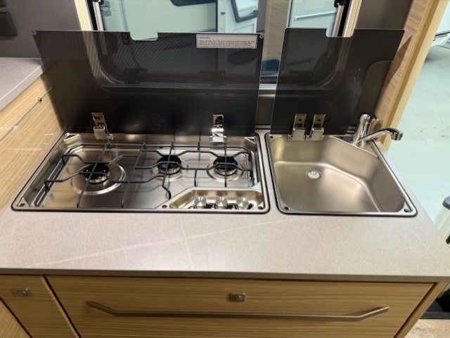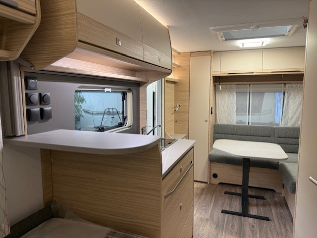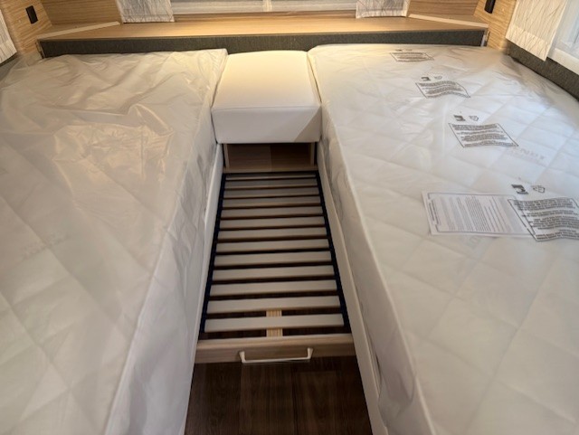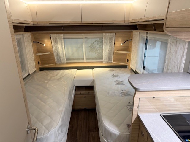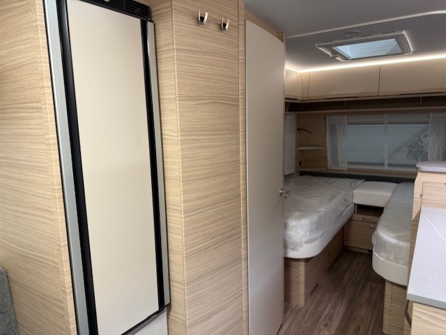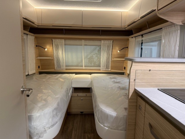 Centraal in de caravan is de goed uitgeruste keuken geplaatst, voorzien van een spoelbak , kookplaat, mengkraan en een royale hoge koelkast.De koelkast is zowel links als rechts te openen waardoor iedereen makkelijk bij de gekoelde etenswaren kan zonder elkaar in de weg te lopen. De warmwater voorziening loopt via de ingebouwde boiler. Door de praktische lades en de apothekerskast zijn uw spullen altijd eenvoudig bereikbaar.Deze lades zijn voorzien van een softclose en transportsluiting. Ook aan de bovenzijde in de keuken vindt u veel opbergruimte. De caravan is aan de voorzijde uitgerust met twee enkele bedden. Om u van een welverdiende nachtrust te laten genieten, hebben de bedden lattebodems met volledig flexibele veerbruggen met hardheidinstelling en fantastische matrassen. Door middel van de bedverbreding maakt u eenvoudig een heerlijk kingsize bed.