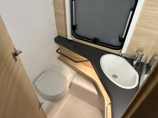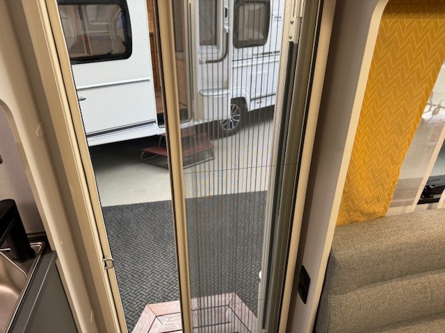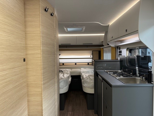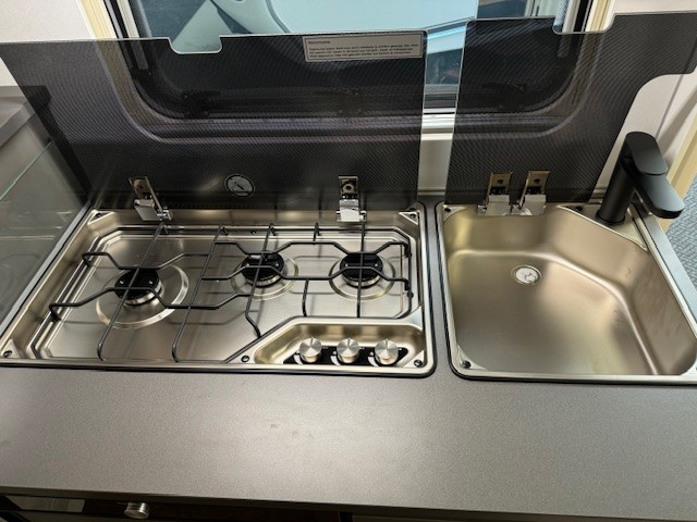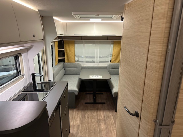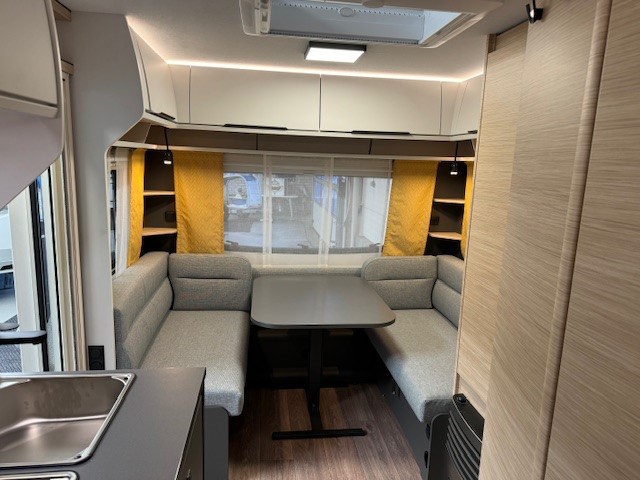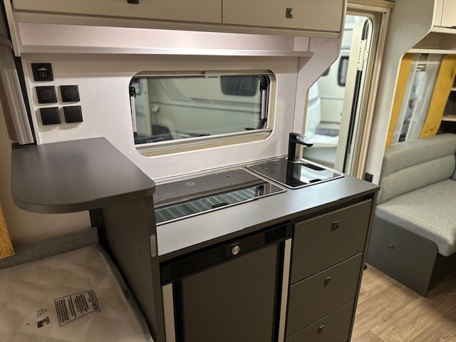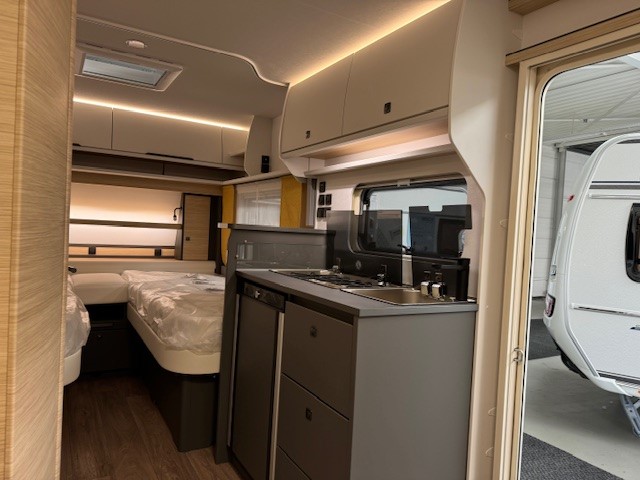 Centraal in de caravan bevindt zich de praktisch ingedeelde middenkeuken, welke geheel compleet is uitgerust met een spoelbak, mengkraan en 3-pits kooktoestel en een ruime koelkast. De handige lades, met softclose zorgen ervoor dat u altijd makkelijk bij uw spullen kunt.Maar ook hier weer veel opbergruimte in de bovenzijde van de keuken.