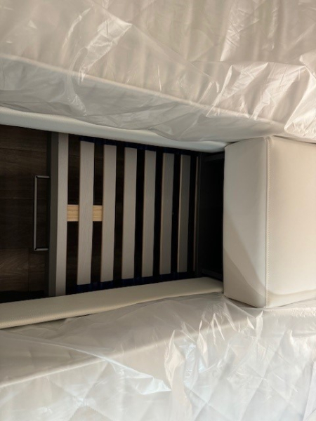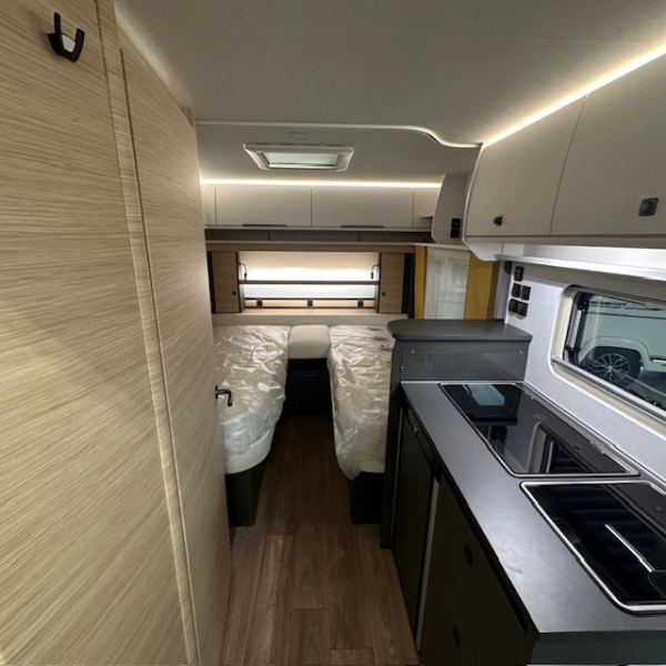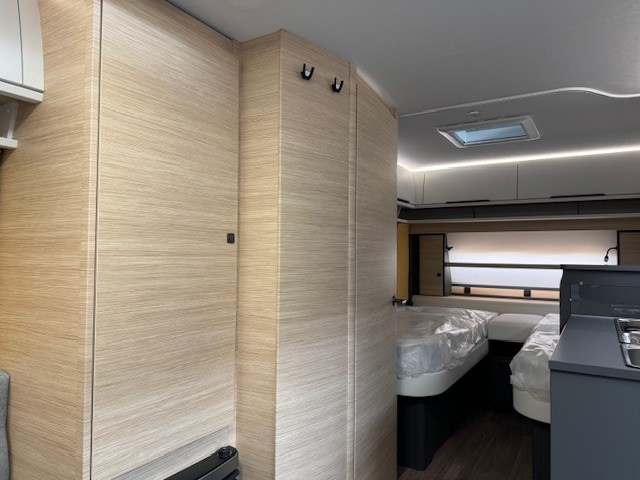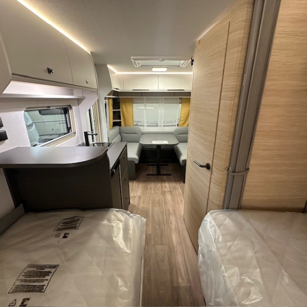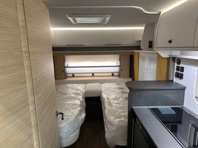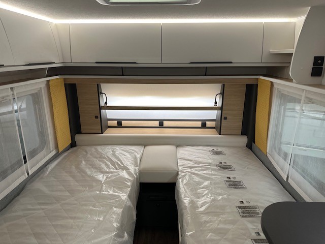 De caravan is aan de voorzijde uitgerust met twee enkele bedden. Om u van een welverdiende nachtrust te laten genieten, hebben de bedden lattebodems met volledig flexibele veerbruggen met hardheidinstelling en heerlijke matrassen. Door middel van de bedverbreding maakt u van deze enkele bedden binnen een handomdraai een kingsize bed. Door de enkele bedden is de ruime hoeveelheid kasten, tel maar, boven de bedden makkelijk bereikbaar. Ook onder beide bedden is er bergruimte. De bergruimte onder het bed aan de voorzijde is ook bereikbaar via het grote serviceluik.