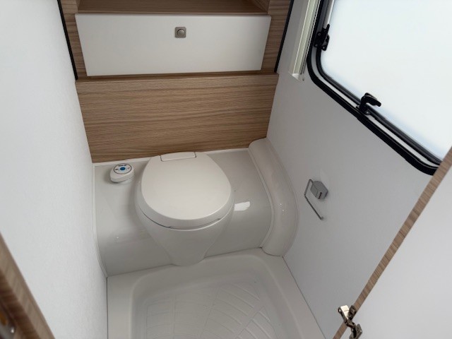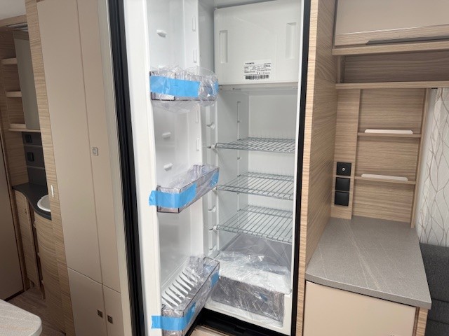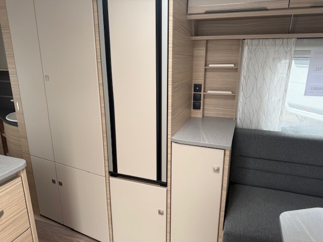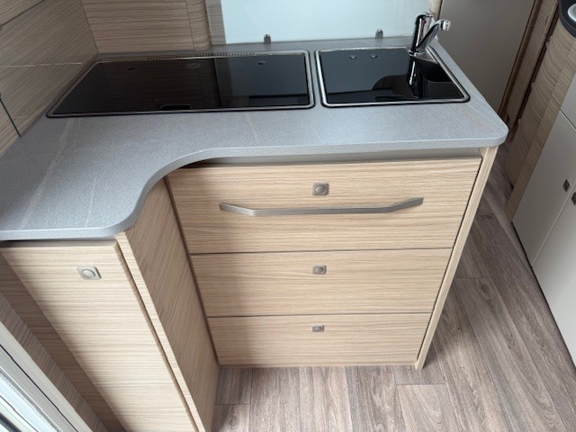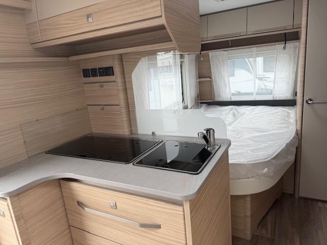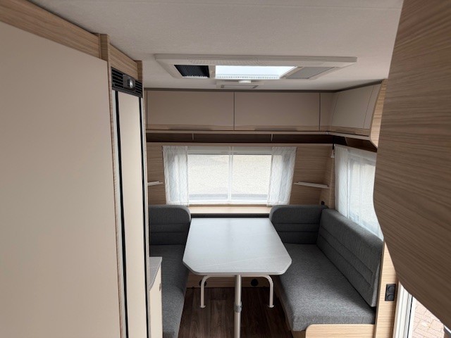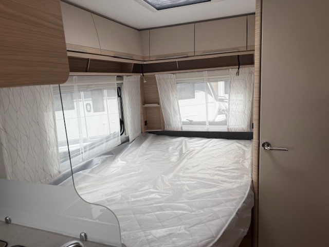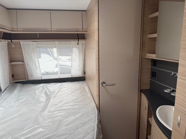 Centraal in de caravan is de goed uitgeruste keuken geplaatst, voorzien van een spoelbak , kookplaat, mengkraan en een royale hoge koelkast.De koelkast is zowel links als rechts te openen waardoor iedereen makkelijk bij de gekoelde etenswaren kan zonder elkaar in de weg te lopen. De warmwatervoorziening is ook aanwezig. Door de praktische lades en de apothekerskast zijn uw spullen altijd eenvoudig bereikbaar. Deze lades zijn voorzien van een softclose en transportsluiting. Ook aan de bovenzijde in de keuken vindt u veel opbergruimte. De caravan is aan de voorzijde uitgerust met een frans bed dat ruimte biedt aan twee personen. Om u van een welverdiende nachtrust te laten genieten, hebben de bedden lattebodems met volledig flexibele veerbruggen met hardheidinstelling en fantastische matrassen.