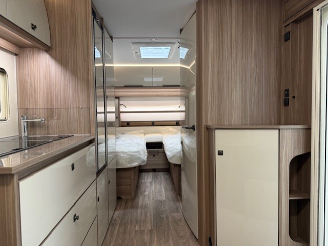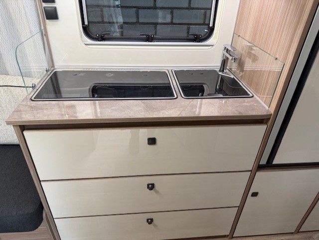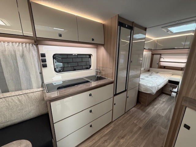 Centraal in de caravan bevindt zich de praktisch ingedeelde middenkeuken, welke geheel compleet is uitgerust met een spoelbak, mengkraan en 3-pits kooktoestel en een hoge overzichtelijke koelkast. De handige lades, met softclose, zorgen ervoor dat u altijd makkelijk bij uw spullen kunt.Maar ook hier weer veel opbergruimte in de bovenzijde van de keuken.