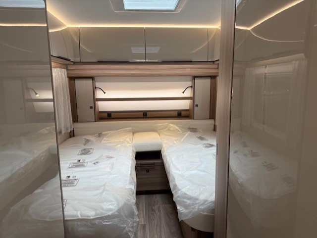 De caravan is aan de voorzijde uitgerust met twee enkele bedden. Om u van een welverdiende nachtrust te laten genieten, hebben de bedden lattebodems met volledig flexibele veerbruggen met hardheidinstelling en zeven zone comfortschuim matrassen. Door de enkele bedden is de ruime hoeveelheid kasten, tel maar, boven de bedden makkelijk bereikbaar. Ook onder beide bedden is er bergruimte. De bergruimte onder het bed aan de voorzijde is ook bereikbaar via het grote serviceluik. Tevens is deze caravan voorzien van een bedverbreding, door middel van een uittrekbare lattebodem tovert u eenvoudig de twee enkele bedden om tot een kingsizebed.