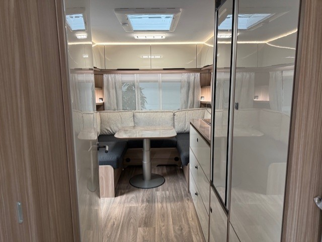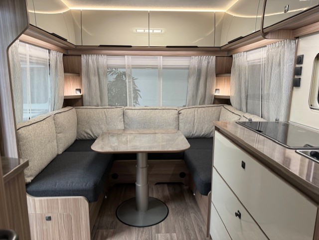 De ruime, gezellige en comfortabele zit aan de achterzijde van de caravan is ideaal om met het hele gezin aan te eten en te drinken. De eenzuils heftafel is zorgt voor veel beenruimte en is traploos verstelbaar. Het zitcomfort is hoog dankzij het hoogsoortelijk gewicht. Uiteraard kan deze zit ook als extra slaapplaats dienen. In een handomdraai tovert u deze om. De ruime hoeveelheid kasten boven de rondzit zorgen ervoor dat u uw spulllen geordend kunt opbergen. Ook onder de zitbanken is een zee van opbergruimte.