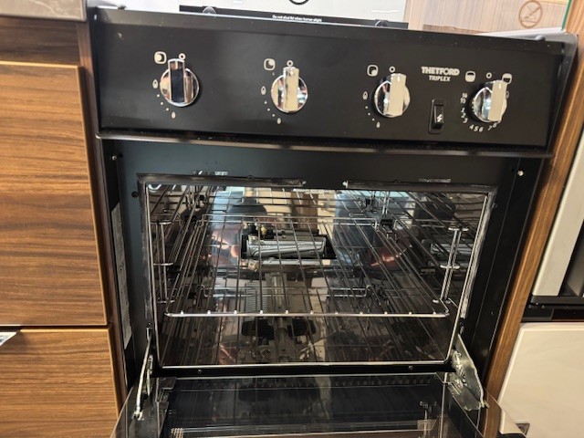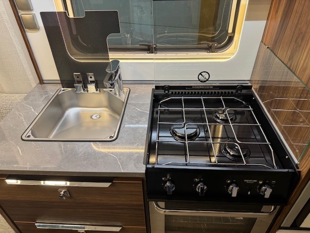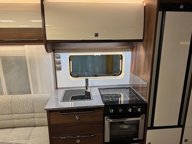 Centraal in de caravan ligt de fantastisch ingedeelde middenkeuken, compleet uitgerust met een spoelbak, mengkraan, 3-pits kooktoestel, een oven en een royale hoge compressorkoelkast. De keuken beschikt over praktische lades met soft-close systeem, waardoor al uw keukenspullen altijd binnen handbereik zijn. Ook boven de keuken is volop kastruimte aanwezig.