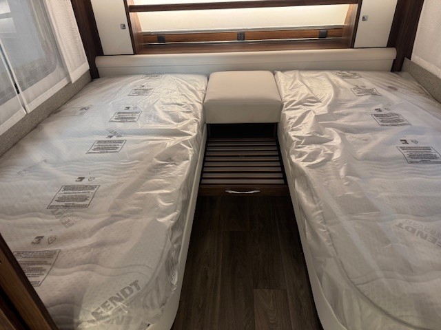 Aan de voorzijde van de caravan vindt u de comfortabele enkele bedden ontworpen voor een heerlijke nachtrust. De bedden zijn voorzien van lattenbodems met volledig flexibele veerbruggen, een instelbare hardheid en 7-zone comfortschuim matrassen. Onder de bedden bevindt zich extra bergruimte, tevens is de ruimte onder een van de bedden bereikbaar is via het grote serviceluik aan de buitenzijde. De caravan in onze showroom is uitgerust met een bedverbreding, hiermee heeft u de mogelijkheid om van deze enkele bedden een kingsize bed te maken.