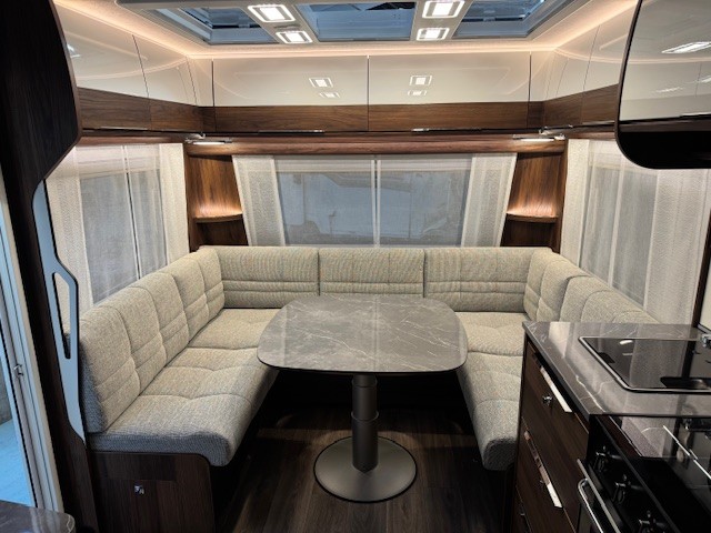 Aan de achterzijde van de caravan bevindt zich de ruime en gezellige rondzit, een heerlijke plek om samen te eten, te ontspannen of de dag rustig af te sluiten. Dankzij de eenzuils heftafel, die traploos verstelbaar is, geniet u van extra beenruimte en optimaal gebruiksgemak. Het zitcomfort is hoog: de zitkussens zijn met binnenvering in de comfort uitvoering en de ergonomisch gevormde rugkussens zorgen voor goede ondersteuning. Uiteraard is deze zithoek ook eenvoudig om te bouwen tot een extra slaapplaats.