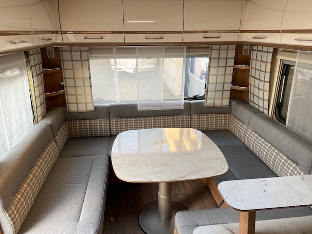 De ruime, gezellige en comfortabele uzit aan de achterzijde van de caravan is ideaal om met het hele gezin aan te eten en te drinken. De eenzuils heftafel is zorgt voor veel beenruimte en is traploos verstelbaar. Het zitcomfort is hoog, de zitkussens zijn in comfortschuim uitgevoerd en de rugkussens ergonomisch gevormd. Uiteraard kan deze zit ook als extra slaapplaats dienen. De royale hoeveelheid kasten boven de rondzit zorgen ervoor dat u uw spulllen geordend kunt opbergen. Ook onder de zitbanken is een zee van opbergruimte.