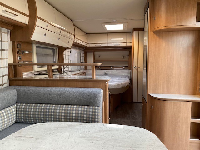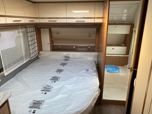 De caravan is aan de voorzijde uitgerust met een frans bed aan de voorzijde van de caravan. Om u van een welverdiende nachtrust te laten genieten, hebben de bedden lattebodems met volledig flexibele veerbruggen met hardheidinstelling en 7 zone comfortschuim matrassen. Ook onder het bed is er bergruimte. De bergruimte onder het bed is ook bereikbaar via het grote serviceluik. T