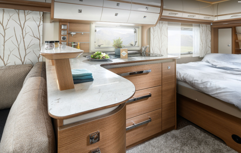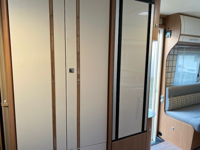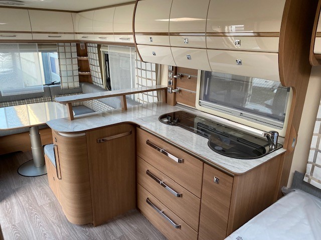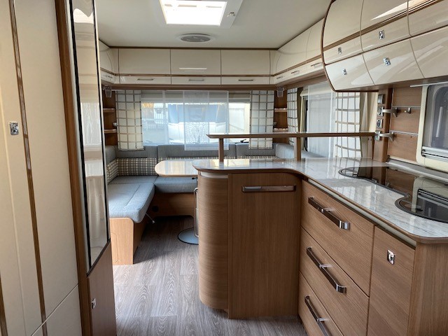 Centraal in de caravan bevindt zich de fantastisch ingedeelde middenkeuken, welke geheel compleet is uitgerust met een spoelbak, mengkraan en 3-pits kooktoestel en koelkast. De handige lades, met softclose, en de apothekerskast zorgen ervoor dat u altijd makkelijk bij uw spullen kunt.Maar ook hier weer veel opbergruimte in de bovenzijde van de keuken. De hoge koelkast is aan de overzijde van de keuken geplaatst. Deze koelkast heeft een inhoud van 133 liter. Bijzonder detail is dat de koelkast zowel links als rechts is te openen. Het vriesvak in deze koelkast is uitneembaar.