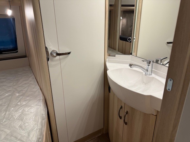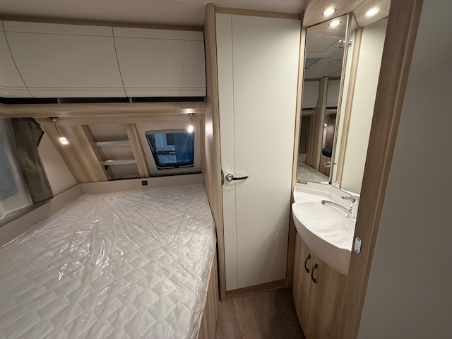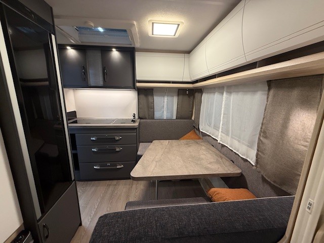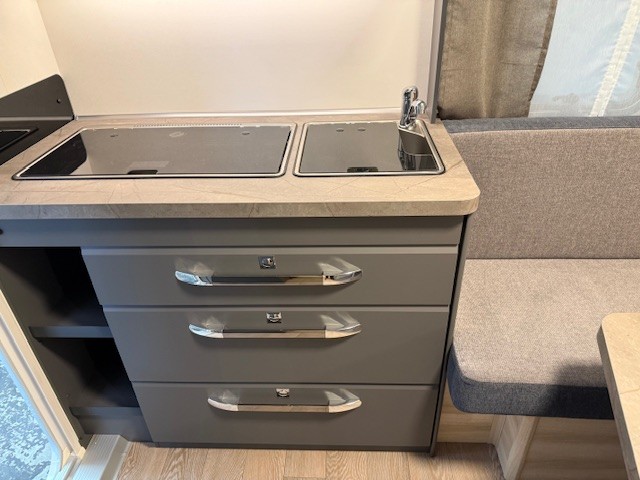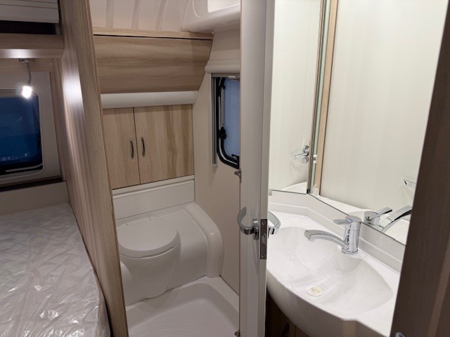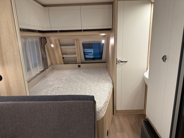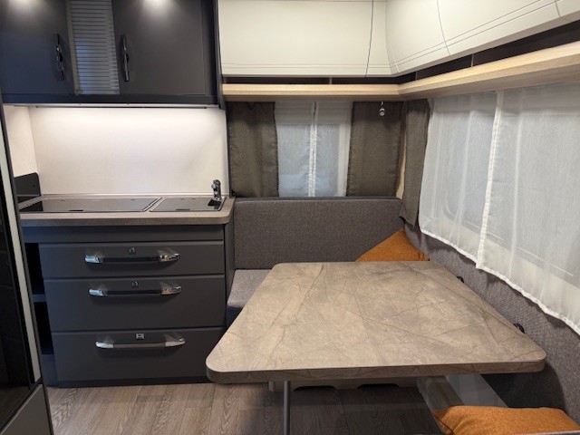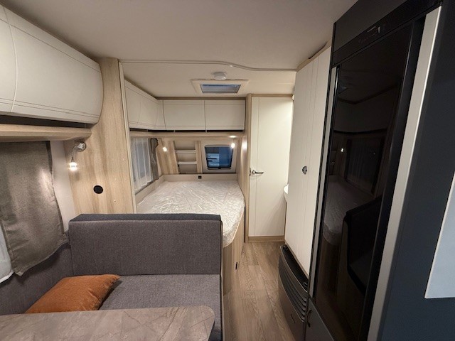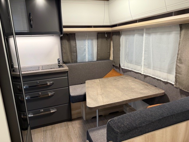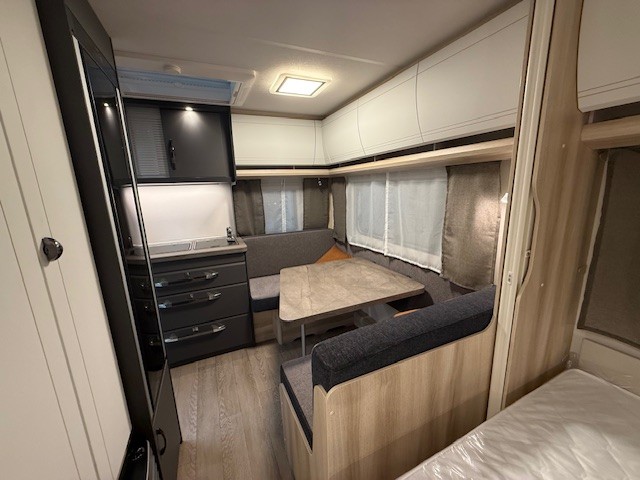 Een prima gelegenheid om gezellig te eten, drinken, lezen en borrelen wordt gevormd door de treinzit aan de achterzijde van de caravan. Uiteraad ook eenvoudig om te bouwen tot een extra slaapplek. De bergruimte onder de banken is ideaal, maar kijk ook eens naar de hoeveelheid kasten boven de zit. De compacte maar complete keuken is naast de zit in de caravan geplaatst en is onder andere uitgerust met een 3-pits gascomfoor, spoelbak en mengkraan. De warmwatervoorziening loopt via de ingebouwde boiler.De ingebouwde koelkast met vriesvak is uitgevoerd in een ruime uitvoering. Ook aan de bovenzijde van de keuken is kastruimte te vinden. De lades aan de onderzijde zorgen ervoor dat uw spullen altijd makkelijk bereikbaar zijn.De caravan beschikt over een comfortabel, tweepersoons bed dat in de lengte is De lattebodems in combinatie met het matras zorgen ervoor dat u heerlijk van uw nachtrust kunt genieten. Ook hier is aan bovenkastjes geen gebrek. De toiletruimte met externe wasgelegenheid is aan de voorzijde geplaatst. Uw bagage kunt u ook van de buitenzijde snel bereiken via het serviceluik. De ringverwarming zorgt voor een goede circulatie van de verwarmde lucht. De stabilisatorkoppeling zorgt voor een merkbare verbetering van het weggedrag van deze caravan. Het dakluik in de caravan zorgt voor een goede ventilatie en tevens voor voldoende daglicht in de caravan. Het luchtcirculatiesysteem zorgt voor een goede verdeling van de verwarmde lucht.