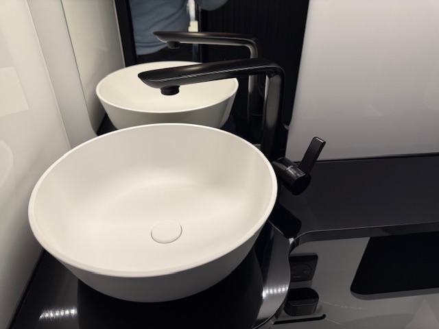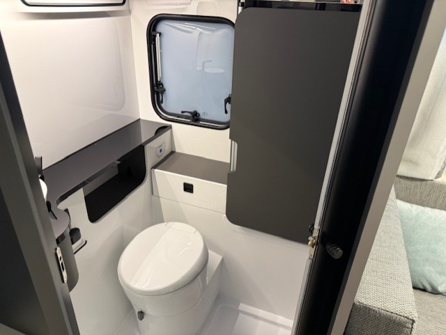 De hoekbadkamer is praktisch ingericht en voorzien van een toilet en wasbak. Deze compacte maar doordachte opstelling zorgt voor comfortabel en gemakkelijk gebruik tijdens uw reis.