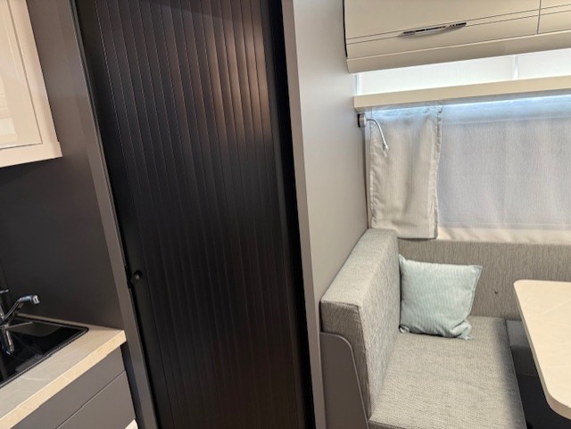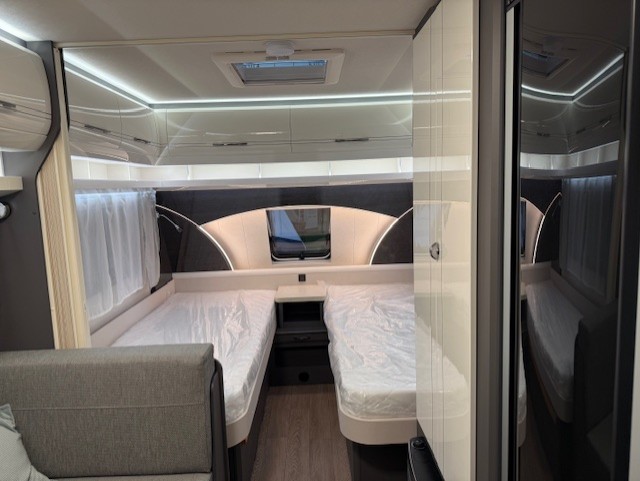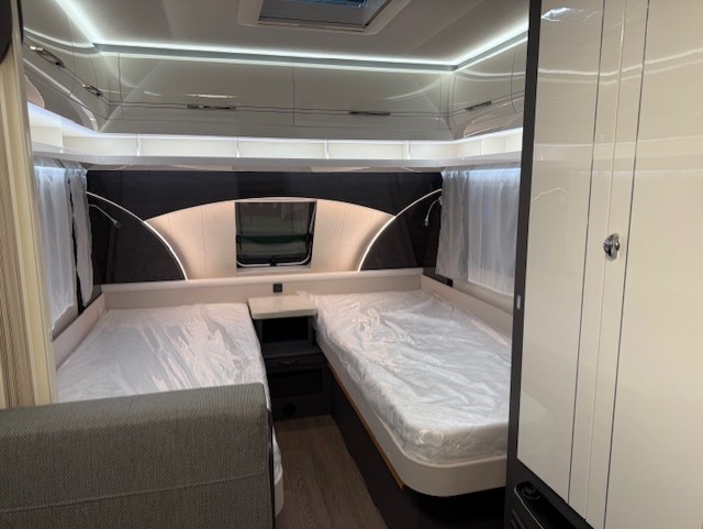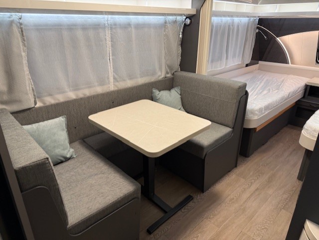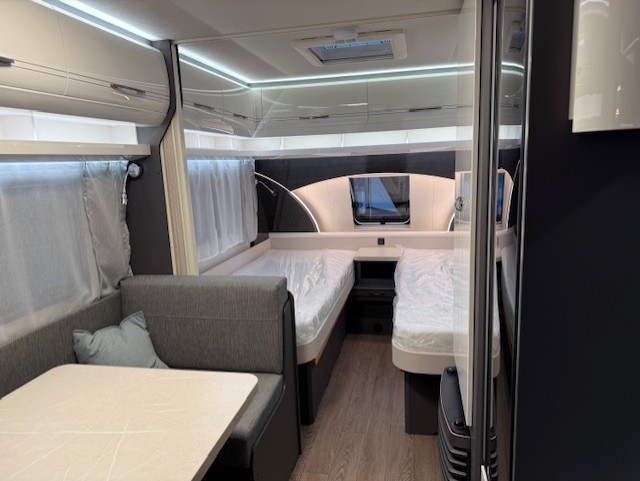 Dankzij de combinatie van enkele bedden en een multifunctionele treinzit wordt de ruimte in de caravan maximaal benut. Overdag dient de treinzit als comfortabele zithoek voor maaltijden of ontspanning, en ’s nachts kan deze eenvoudig worden omgebouwd tot extra slaapplaats.