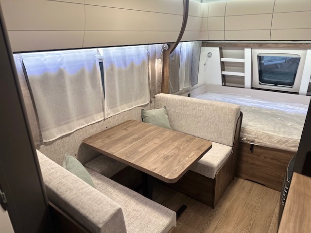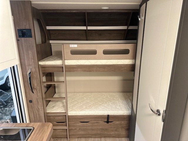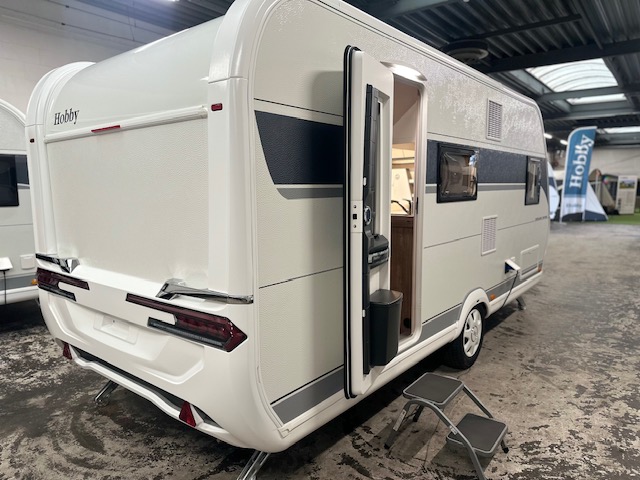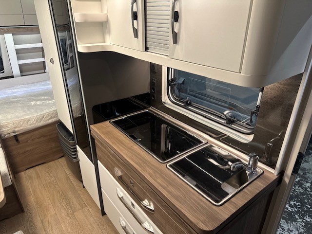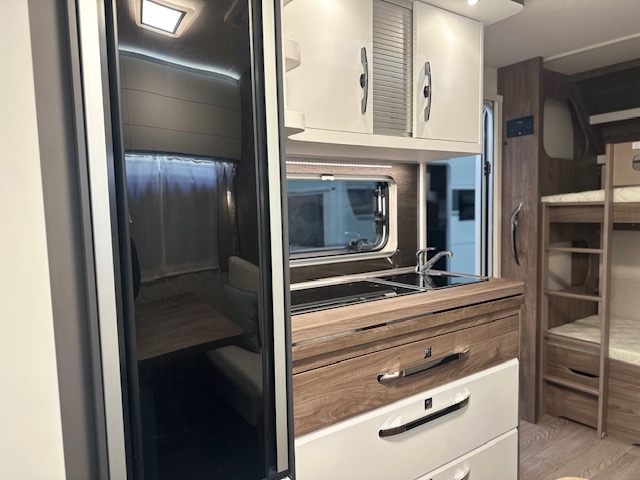 Ook de luxe uitgeruste keuken bevindt zich centraal in dit model. De keuken is voorzien van een spoelbak een mengkraan een 3 pits kooktoestel en een koelkast in een hoge uitvoering, handig en overzichtelijk. Ruime lades, met softclose, waardoor u makkelijk bij al uw spulletjes kunt. En kijk eens naar de opbergruimte aan de bovenzijde van de keuken, daar kan veel in. De warmwatervoorziening loopt via de ingebouwde boiler. Achter in de caravan is het stapelbed over dwars geplaatst. Als het onderste bed opgeklapt is kan dit dienen als speelruimte voor de kinderen. Daarnaast de toiletruimte met interne wasgelegenheid. Een grote hoeveelheid bergruimte is ideaal. De ingebouwde stabilisator koppeling zorgt voor een stabiele wegligging. Het grote dakluik van de caravan zorgt voor extra veel lichtinval en een goede ventilatie. Het luchtcirculatiesysteem zorgt daarbij voor een goede verdeling van de verwarmde lucht. De caravan beschikt over talrijke lichtelementen die zorgen voor een unieke atmosfeer.De prachtige hobby wieldoppen staan er fantastisch bij. De verzwaarde uitdraaisteunen geven de caravan extra stabiliteit.